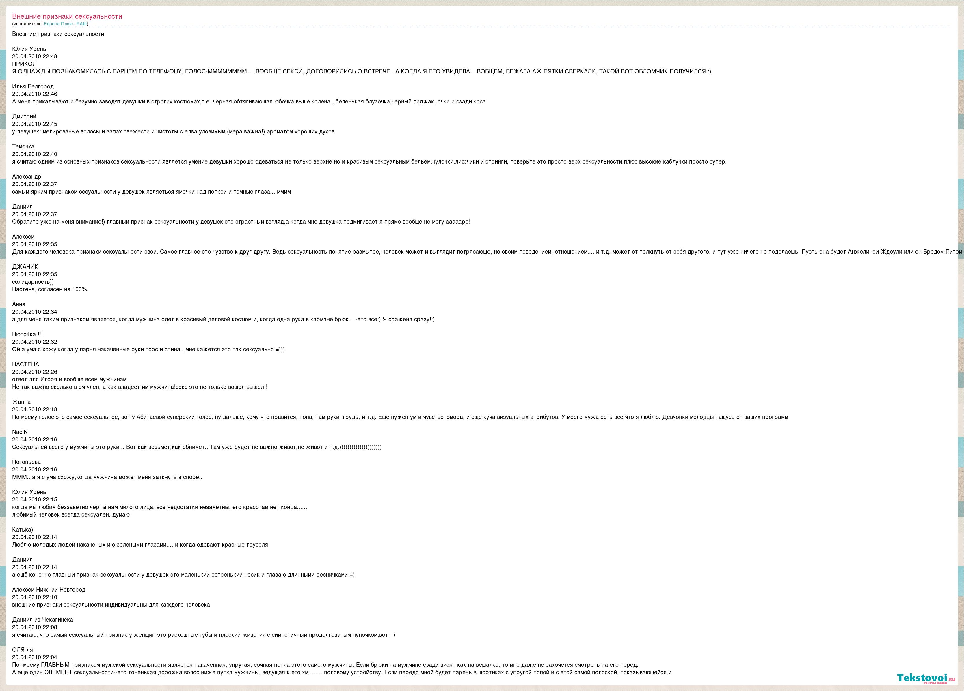 Внешние признаки сексуальности Юлия Урень 20.04.2010 22:48 ПРИКОЛ Я ОДНАЖДЫ ПОЗНАКОМИЛАСЬ С ПАРНЕМ ПО ТЕЛЕФОНУ, ГОЛОС-ММММММММ.....ВООБЩЕ СЕКСИ, ДОГОВОРИЛИСЬ О ВСТРЕЧЕ...А КОГДА Я ЕГО УВИДЕЛА....ВОБЩЕМ, БЕЖАЛА АЖ ПЯТКИ СВЕРКАЛИ, ТАКОЙ ВОТ ОБЛОМЧИК ПОЛУЧИЛСЯ :) Илья Белгород 20.04.2010 22:46 А меня прикалывают и безумно заводят девушки в строгих костюмах,т.е. черная обтягивающая юбочка выше колена , беленькая блузочка,черный пиджак, очки и сзади коса. Дмитрий 20.04.2010 22:45 у девушек: мелированые волосы и запах свежести и чистоты с едва уловимым (мера важна!) ароматом хороших духов Темочка 20.04.2010 22:40 я считаю одним из основных признаков сексуальности является умение девушки хорошо одеваться,не только верхне но и красивым сексуальным бельем,чулочки,лифчики и стринги, поверьте это просто верх сексуальности,плюс высокие каблучки просто супер. Александр 20.04.2010 22:37 самым ярким признаком сесуальности у девушек являеться ямочки над попкой и томные глаза....мммм Даниил 20.04.2010 22:37 Обратите уже на меня внимание!) главный признак сексуальности у девушек это страстный взгляд,а когда мне девушка подмигивает я прямо вообще не могу ааааарр! Алексей 20.04.2010 22:35 Для каждого человека признаки сексуальности свои. Самое главное это чувство к друг другу. Ведь сексуальность понятие размытое, человек может и выглядит потрясающе, но своим поведением, отношением.... и т.д. может от толкнуть от себя другого. и тут уже ничего не поделаешь. Пусть она будет Анжелиной Ждоули или он Бредом Питом. ДЖАНИК 20.04.2010 22:35 солидарность)) Настена, согласен на 100% Анна 20.04.2010 22:34 а для меня таким признаком является, когда мужчина одет в красивый деловой костюм и, когда одна рука в кармане брюк... -это все:) Я сражена сразу!:) Нюто4ка !!! 20.04.2010 22:32 Ой а ума с хожу когда у парня накаченные руки торс и спина , мне кажется это так сексуально =))) НАСТЕНА 20.04.2010 22:26 ответ для Игоря и вообще всем мужчинам Не так важно сколько в см член, а как владеет им мужчина!секс это не только вошел-вышел!! Жанна 20.04.2010 22:18 По моему голос это самое сексуальное, вот у Абитаевой суперский голос, ну дальше, кому что нравится, попа, там руки, грудь, и т.д. Еще нужен ум и чувство юмора, и еще куча визуальных атрибутов. У моего мужа есть все что я люблю. Девчонки молодцы тащусь от ваших программ NadiN 20.04.2010 22:16 Сексуальней всего у мужчины это руки... Вот как возьмет,как обнимет...Там уже будет не важно живот,не живот и т.д.))))))))))))))))))))) Погоньева 20.04.2010 22:16 МММ...а я с ума схожу,когда мужчина может меня заткнуть в споре.. Юлия Урень 20.04.2010 22:15 когда мы любим беззаветно черты нам милого лица, все недостатки незаметны, его красотам нет конца...... любимый человек всегда сексуален, думаю Катька) 20.04.2010 22:14 Люблю молодых людей накаченых и с зелеными глазами.... и когда одевают красные труселя Даниил 20.04.2010 22:14 а ещё конечно главный признак сексуальности у девушек это маленький остренький носик и глаза с длинными ресничками =) Алексей Нижний Новгород 20.04.2010 22:10 внешние признаки сексуальности индивидуальны для каждого человека Даниил из Чекагинска 20.04.2010 22:08 я считаю, что самый сексуальный признак у женщин это раскошные губы и плоский животик с симпотичным продолговатым пупочком,вот =) ОЛЯ-ля 20.04.2010 22:04 По- моему ГЛАВНЫМ признаком мужской сексуальности является накаченная, упругая, сочная попка этого самого мужчины. Если брюки на мужчине сзади висят как на вешалке, то мне даже не захоч