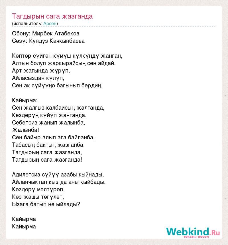 Обону: Мирбек Атабеков Сөзү: Кундуз Качкынбаева Көптөр сүйгөн күмүш күлкүңдү жанган, Алтын болуп жаркырайсың сен айдай. Арт жагында жүрүп, Айласыздан күлүп, Сен ак сүйүүңө багынып бердиң. Кайырма: Сен жалгыз калбайсың жалганда, Көздөрүң күйүп жанганда. Себепсиз жанып жалынба, Жалынба! Сен байыр алып ага байланба, Табасың бактың жазганба. Тагдырың сага жазганда, Тагдырың сага жазганда! Адилетсиз сүйүү азабы кыйнады, Айланчыктап кыз да аны кыйбады. Көздөрү мөлтүрөп, Көз жашы төгүлөт, Ызага батып не ыйлады? Кайырма Кайырма