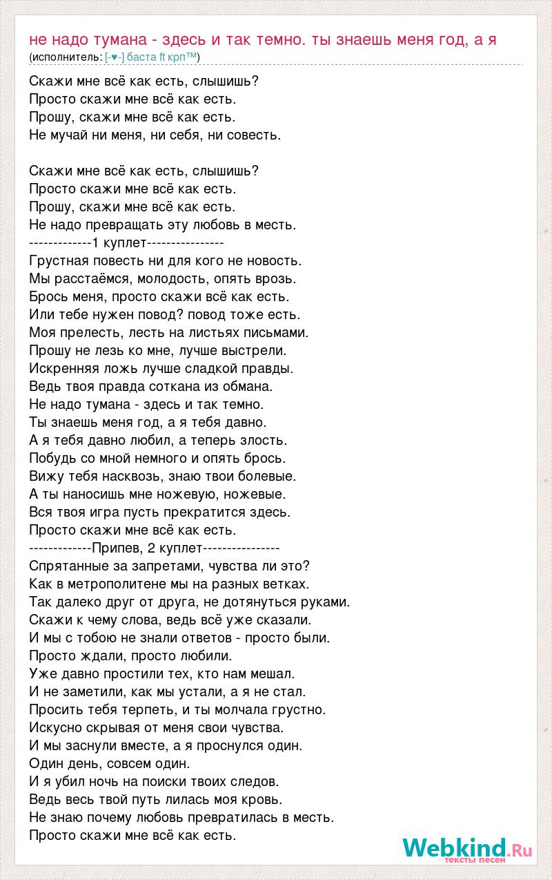 Скажи мне всё как есть, слышишь? Просто скажи мне всё как есть. Прошу, скажи мне всё как есть. Не мучай ни меня, ни себя, ни совесть. Скажи мне всё как есть, слышишь? Просто скажи мне всё как есть. Прошу, скажи мне всё как есть. Не надо превращать эту любовь в месть. -------------1 куплет---------------- Грустная повесть ни для кого не новость. Мы расстаёмся, молодость, опять врозь. Брось меня, просто скажи всё как есть. Или тебе нужен повод? повод тоже есть. Моя прелесть, лесть на листьях письмами. Прошу не лезь ко мне, лучше выстрели. Искренняя ложь лучше сладкой правды. Ведь твоя правда соткана из обмана. Не надо тумана - здесь и так темно. Ты знаешь меня год, а я тебя давно. А я тебя давно любил, а теперь злость. Побудь со мной немного и опять брось. Вижу тебя насквозь, знаю твои болевые. А ты наносишь мне ножевую, ножевые. Вся твоя игра пусть прекратится здесь. Просто скажи мне всё как есть. -------------Припев, 2 куплет---------------- Спрятанные за запретами, чувства ли это? Как в метрополитене мы на разных ветках. Так далеко друг от друга, не дотянуться руками. Скажи к чему слова, ведь всё уже сказали. И мы с тобою не знали ответов - просто были. Просто ждали, просто любили. Уже давно простили тех, кто нам мешал. И не заметили, как мы устали, а я не стал. Просить тебя терпеть, и ты молчала грустно. Искусно скрывая от меня свои чувства. И мы заснули вместе, а я проснулся один. Один день, совсем один. И я убил ночь на поиски твоих следов. Ведь весь твой путь лилась моя кровь. Не знаю почему любовь превратилась в месть. Просто скажи мне всё как есть.