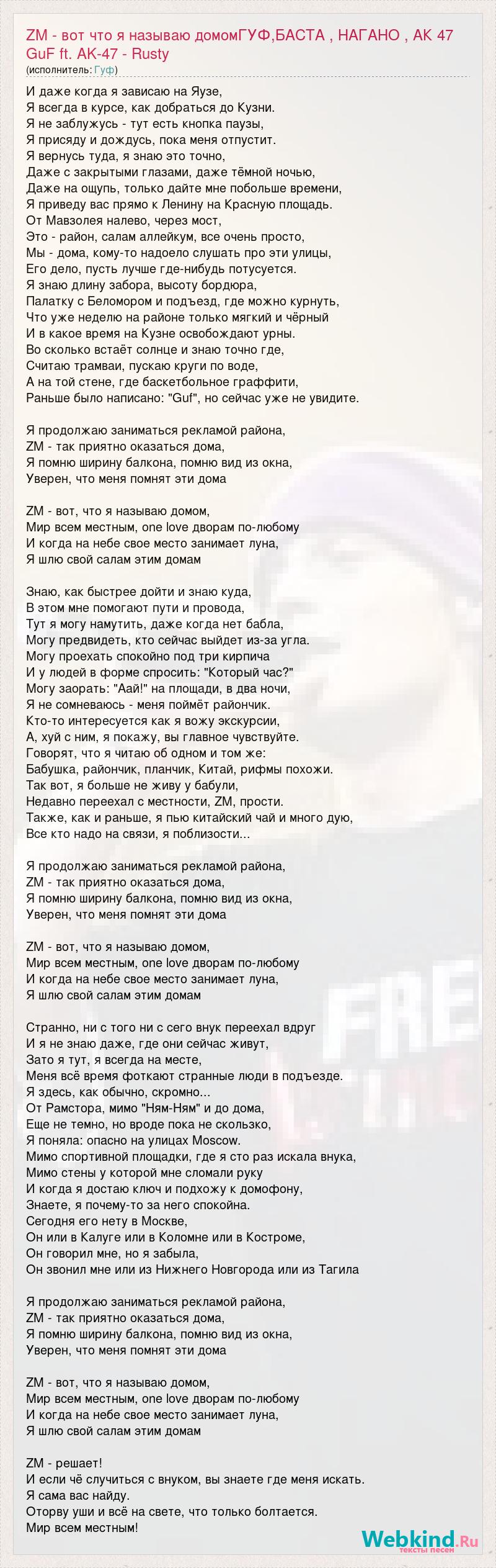 И даже когда я зависаю на Яузе, Я всегда в курсе, как добраться до Кузни. Я не заблужусь - тут есть кнопка паузы, Я присяду и дождусь, пока меня отпустит. Я вернусь туда, я знаю это точно, Даже с закрытыми глазами, даже тёмной ночью, Даже на ощупь, только дайте мне побольше времени, Я приведу вас прямо к Ленину на Красную площадь. От Мавзолея налево, через мост, Это - район, салам аллейкум, все очень просто, Мы - дома, кому-то надоело слушать про эти улицы, Его дело, пусть лучше где-нибудь потусуется. Я знаю длину забора, высоту бордюра, Палатку с Беломором и подъезд, где можно курнуть, Что уже неделю на районе только мягкий и чёрный И в какое время на Кузне освобождают урны. Во сколько встаёт солнце и знаю точно где, Считаю трамваи, пускаю круги по воде, А на той стене, где баскетбольное граффити, Раньше было написано: "Guf", но сейчас уже не увидите. Я продолжаю заниматься рекламой района, ZM - так приятно оказаться дома, Я помню ширину балкона, помню вид из окна, Уверен, что меня помнят эти дома ZM - вот, что я называю домом, Мир всем местным, one love дворам по-любому И когда на небе свое место занимает луна, Я шлю свой салам этим домам Знаю, как быстрее дойти и знаю куда, В этом мне помогают пути и провода, Тут я могу намутить, даже когда нет бабла, Могу предвидеть, кто сейчас выйдет из-за угла. Могу проехать спокойно под три кирпича И у людей в форме спросить: "Который час?" Могу заорать: "Аай!" на площади, в два ночи, Я не сомневаюсь - меня поймёт райончик. Кто-то интересуется как я вожу экскурсии, А, хуй с ним, я покажу, вы главное чувствуйте. Говорят, что я читаю об одном и том же: Бабушка, райончик, планчик, Китай, рифмы похожи. Так вот, я больше не живу у бабули, Недавно переехал с местности, ZM, прости. Также, как и раньше, я пью китайский чай и много дую, Все кто надо на связи, я поблизости... Я продолжаю заниматься рекламой района, ZM - так приятно оказаться дома, Я помню ширину балкона, помню вид из окна, Уверен, что меня помнят эти дома ZM - вот, что я называю домом, Мир всем местным, one love дворам по-любому И когда на небе свое место занимает луна, Я шлю свой салам этим домам Странно, ни с того ни с сего внук переехал вдруг И я не знаю даже, где они сейчас живут, Зато я тут, я всегда на месте, Меня всё время фоткают странные люди в подъезде. Я здесь, как обычно, скромно... От Рамстора, мимо "Ням-Ням" и до дома, Еще не темно, но вроде пока не скользко, Я поняла: опасно на улицах Moscow. Мимо спортивной площадки, где я сто раз искала внука, Мимо стены у которой мне сломали руку И когда я достаю ключ и подхожу к домофону, Знаете, я почему-то за него спокойна. Сегодня его нету в Москве, Он или в Калуге или в Коломне или в Костроме, Он говорил мне, но я забыла, Он звонил мне или из Нижнего Новгорода или из Тагила Я продолжаю заниматься рекламой района, ZM - так приятно оказаться дома, Я помню ширину балкона, помню вид из окна, Уверен, что меня помнят эти дома ZM - вот, что я называю домом, Мир всем местным, one love дворам по-любому И когда на небе свое место занимает луна, Я шлю свой салам этим домам ZM - решает! И если чё случиться с внуком, вы знаете где меня искать. Я сама вас найду. Оторву уши и всё на свете, что только болтается. Мир всем местным!