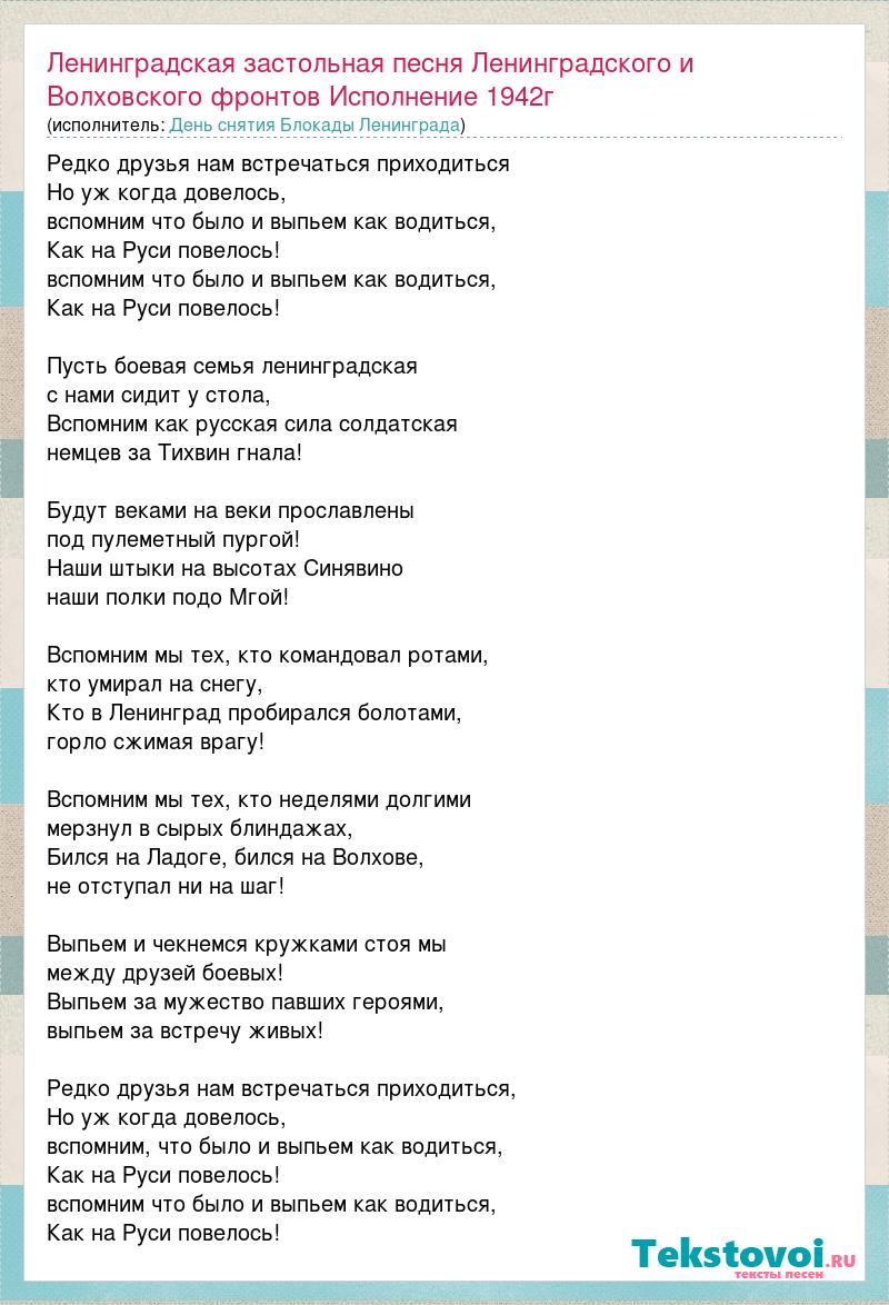Редко друзья нам встречаться приходиться Но уж когда довелось, вспомним что было и выпьем как водиться, Как на Руси повелось! вспомним что было и выпьем как водиться, Как на Руси повелось! Пусть боевая семья ленинградская с нами сидит у стола, Вспомним как русская сила солдатская немцев за Тихвин гнала! Будут веками на веки прославлены под пулеметный пургой! Наши штыки на высотах Синявино наши полки подо Мгой! Вспомним мы тех, кто командовал ротами, кто умирал на снегу, Кто в Ленинград пробирался болотами, горло сжимая врагу! Вспомним мы тех, кто неделями долгими мерзнул в сырых блиндажах, Бился на Ладоге, бился на Волхове, не отступал ни на шаг! Выпьем и чекнемся кружками стоя мы между друзей боевых! Выпьем за мужество павших героями, выпьем за встречу живых! Редко друзья нам встречаться приходиться, Но уж когда довелось, вспомним, что было и выпьем как водиться, Как на Руси повелось! вспомним что было и выпьем как водиться, Как на Руси повелось!