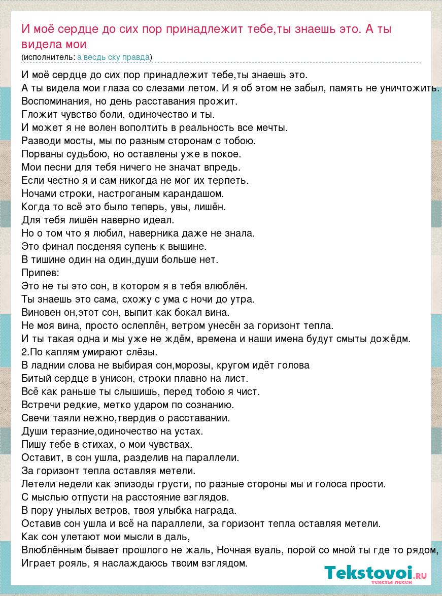 Главная→Исполнители→А весдь ску правда→И моё сердце до сих пор принадлежит тебе,ты знаешь это. А ты видела мои
