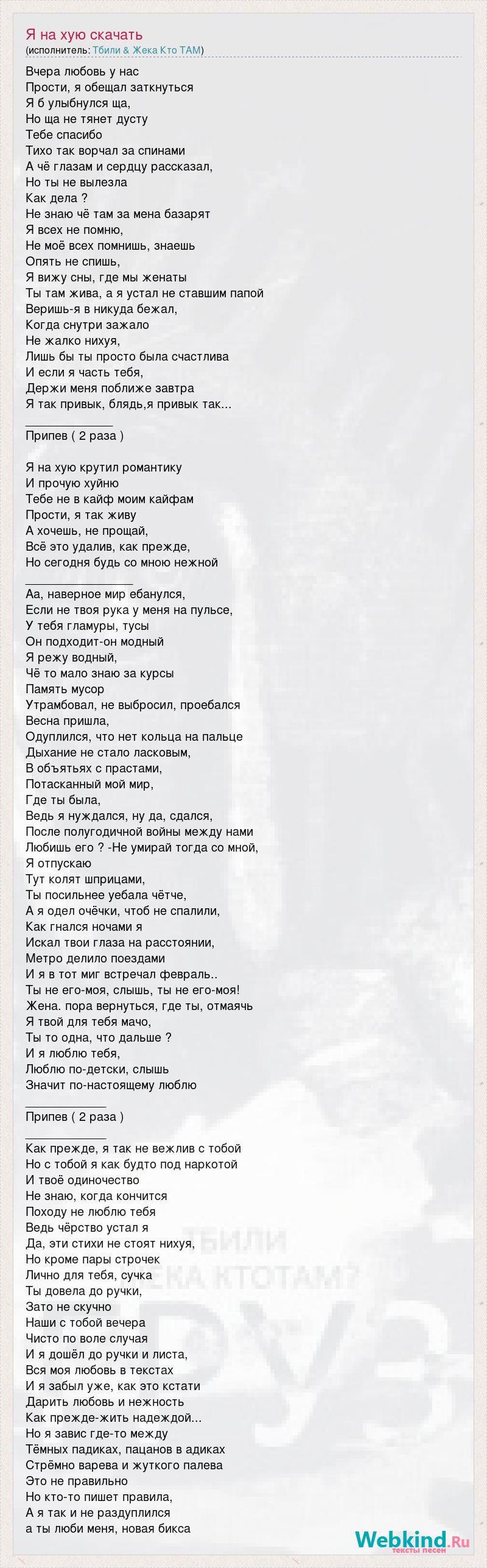 Вчера любовь у нас Прости, я обещал заткнуться Я б улыбнулся ща, Но ща не тянет дусту Тебе спасибо Тихо так ворчал за спинами А чё глазам и сердцу рассказал, Но ты не вылезла Как дела ? Не знаю чё там за мена базарят Я всех не помню, Не моё всех помнишь, знаешь Опять не спишь, Я вижу сны, где мы женаты Ты там жива, а я устал не ставшим папой Веришь-я в никуда бежал, Когда снутри зажало Не жалко нихуя, Лишь бы ты просто была счастлива И если я часть тебя, Держи меня поближе завтра Я так привык, блядь,я привык так... _____________ Припев ( 2 раза ) Я на хую крутил романтику И прочую хуйню Тебе не в кайф моим кайфам Прости, я так живу А хочешь, не прощай, Всё это удалив, как прежде, Но сегодня будь со мною нежной ________________ Аа, наверное мир ебанулся, Если не твоя рука у меня на пульсе, У тебя гламуры, тусы Он подходит-он модный Я режу водный, Чё то мало знаю за курсы Память мусор Утрамбовал, не выбросил, проебался Весна пришла, Одуплился, что нет кольца на пальце Дыхание не стало ласковым, В объятьях с прастами, Потасканный мой мир, Где ты была, Ведь я нуждался, ну да, сдался, После полугодичной войны между нами Любишь его ? -Не умирай тогда со мной, Я отпускаю Тут колят шприцами, Ты посильнее уебала чётче, А я одел очёчки, чтоб не спалили, Как гнался ночами я Искал твои глаза на расстоянии, Метро делило поездами И я в тот миг встречал февраль.. Ты не его-моя, слышь, ты не его-моя! Жена. пора вернуться, где ты, отмаячь Я твой для тебя мачо, Ты то одна, что дальше ? И я люблю тебя, Люблю по-детски, слышь Значит по-настоящему люблю ____________ Припев ( 2 раза ) ____________ Как прежде, я так не вежлив с тобой Но с тобой я как будто под наркотой И твоё одиночество Не знаю, когда кончится Походу не люблю тебя Ведь чёрство устал я Да, эти стихи не стоят нихуя, Но кроме пары строчек Лично для тебя, сучка Ты довела до ручки, Зато не скучно Наши с тобой вечера Чисто по воле случая И я дошёл до ручки и листа, Вся моя любовь в текстах И я забыл уже, как это кстати Дарить любовь и нежность Как прежде-жить надеждой... Но я завис где-то между Тёмных падиках, пацанов в адиках Стрёмно варева и жуткого палева Это не правильно Но кто-то пишет правила, А я так и не раздуплился а ты люби меня, новая бикса