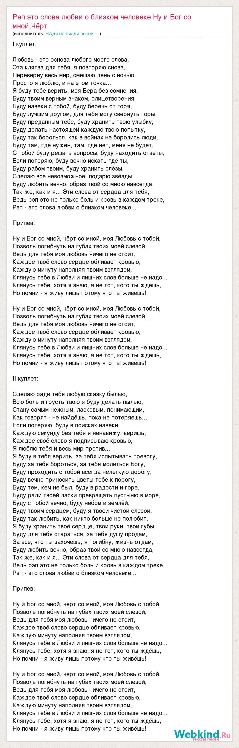 I куплет: Любовь - это основа любого моего слова, Эта клятва для тебя, я повторяю снова, Переверну весь мир, смешаю день с ночью, Просто я люблю, и на этом точка... Я буду тебе верить, моя Вера без сомнения, Буду твоим верным знаком, олицетворения, Буду навеки с тобой, буду беречь от горя, Буду лучшим другом, для тебя могу свернуть горы, Буду преданным тебе, буду хранить твою улыбку, Буду делать настоящей каждую твою попытку, Буду так бороться, как в войнах не боролись люди, Буду там, где нужен, там, где нет, меня не будет, С тобой буду решать вопросы, буду находить ответы, Если потеряю, буду вечно искать где ты, Буду рабом твоим, буду хранить слёзы, Сделаю все невозможное, подарю звёзды, Буду любить вечно, образ твой со мною навсегда, Так же, как и я... Эти слова от сердца для тебя, Ведь рэп это не только боль и кровь в каждом треке, Рэп - это слова любви о близком человеке... Припев: Ну и Бог со мной, чёрт со мной, моя Любовь с тобой, Позволь погибнуть на губах твоих моей слезой, Ведь для тебя моя любовь ничего не стоит, Каждое твоё слово сердце обливает кровью, Каждую минуту наполняя твоим взглядом, Клянусь тебе в Любви и лишних слов больше не надо... Клянусь тебе, хотя я знаю, я не тот, кого ты ждёшь, Но помни - я живу лишь потому что ты живёшь! Ну и Бог со мной, чёрт со мной, моя Любовь с тобой, Позволь погибнуть на губах твоих моей слезой, Ведь для тебя моя любовь ничего не стоит, Каждое твоё слово сердце обливает кровью, Каждую минуту наполняя твоим взглядом, Клянусь тебе в Любви и лишних слов больше не надо... Клянусь тебе, хотя я знаю, я не тот, кого ты ждёшь, Но помни - я живу лишь потому что ты живёшь! II куплет: Сделаю ради тебя любую сказку былью, Всю боль и грусть твою я буду делать пылью, Стану самым нежным, ласковым, понимающим, Как говорят - не найдёшь, пока не потеряешь... Если потеряю, буду в поисках навеки, Каждую секунду без тебя я ненавижу, веришь, Каждое своё слово я подписываю кровью, Я люблю тебя и весь мир против... Я буду в тебя верить, за тебя испытывать тревогу, Буду за тебя бороться, за тебя молиться Богу, Буду проходить с тобой всегда нелегкую дорогу, Буду вечно приносить цветы тебе к порогу, Буду тем, кем не был, буду в радости и горе, Буду ради твоей ласки превращать пустыню в море, Буду с тобой вечно, буду небом и землёй, Буду твоим сердцем, буду я твоей чистой слезой, Буду так любить, как никто больше не полюбит, Я буду хранить твоё сердце, твои руки, твои губы, Буду для тебя стараться, за тебя душу продам, За все, что ты захочешь, я погибну, жизнь отдам, Буду любить вечно, образ твой со мною навсегда, Так же, как и я... Эти слова от сердца для тебя, Ведь рэп это не только боль и кровь в каждом треке, Рэп - это слова любви о близком человеке... Припев: Ну и Бог со мной, чёрт со мной, моя Любовь с тобой, Позволь погибнуть на губах твоих моей слезой, Ведь для тебя моя любовь ничего не стоит, Каждое твоё слово сердце обливает кровью, Каждую минуту наполняя твоим взглядом, Клянусь тебе в Любви и лишних слов больше не надо... Клянусь тебе, хотя я знаю, я не тот, кого ты ждёшь, Но помни - я живу лишь потому что ты живёшь! Ну и Бог со мной, чёрт со мной, моя Любовь с тобой, Позволь погибнуть на губах твоих моей слезой, Ведь для тебя моя любовь ничего не стоит, Каждое твоё слово сердце обливает кровью, Каждую минуту наполняя твоим взглядом, Клянусь тебе в Любви и лишних слов больше не надо... Кляну