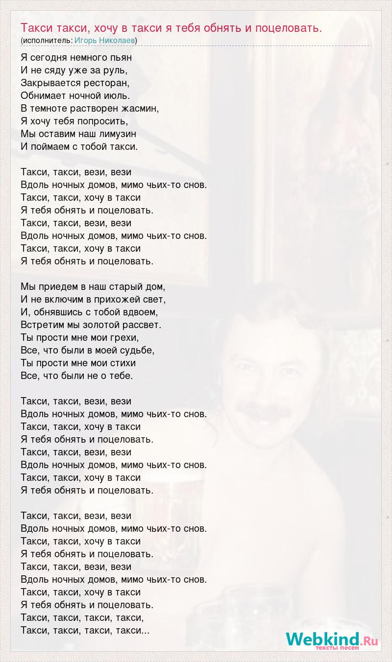 Я сегодня немного пьян И не сяду уже за руль, Закрывается ресторан, Обнимает ночной июль. В темноте растворен жасмин, Я хочу тебя попросить, Мы оставим наш лимузин И поймаем с тобой такси. Такси, такси, вези, вези Вдоль ночных домов, мимо чьих-то снов. Такси, такси, хочу в такси Я тебя обнять и поцеловать. Такси, такси, вези, вези Вдоль ночных домов, мимо чьих-то снов. Такси, такси, хочу в такси Я тебя обнять и поцеловать. Мы приедем в наш старый дом, И не включим в прихожей свет, И, обнявшись с тобой вдвоем, Встретим мы золотой рассвет. Ты прости мне мои грехи, Все, что были в моей судьбе, Ты прости мне мои стихи Все, что были не о тебе. Такси, такси, вези, вези Вдоль ночных домов, мимо чьих-то снов. Такси, такси, хочу в такси Я тебя обнять и поцеловать. Такси, такси, вези, вези Вдоль ночных домов, мимо чьих-то снов. Такси, такси, хочу в такси Я тебя обнять и поцеловать. Такси, такси, вези, вези Вдоль ночных домов, мимо чьих-то снов. Такси, такси, хочу в такси Я тебя обнять и поцеловать. Такси, такси, вези, вези Вдоль ночных домов, мимо чьих-то снов. Такси, такси, хочу в такси Я тебя обнять и поцеловать. Такси, такси, такси, такси, Такси, такси, такси, такси...