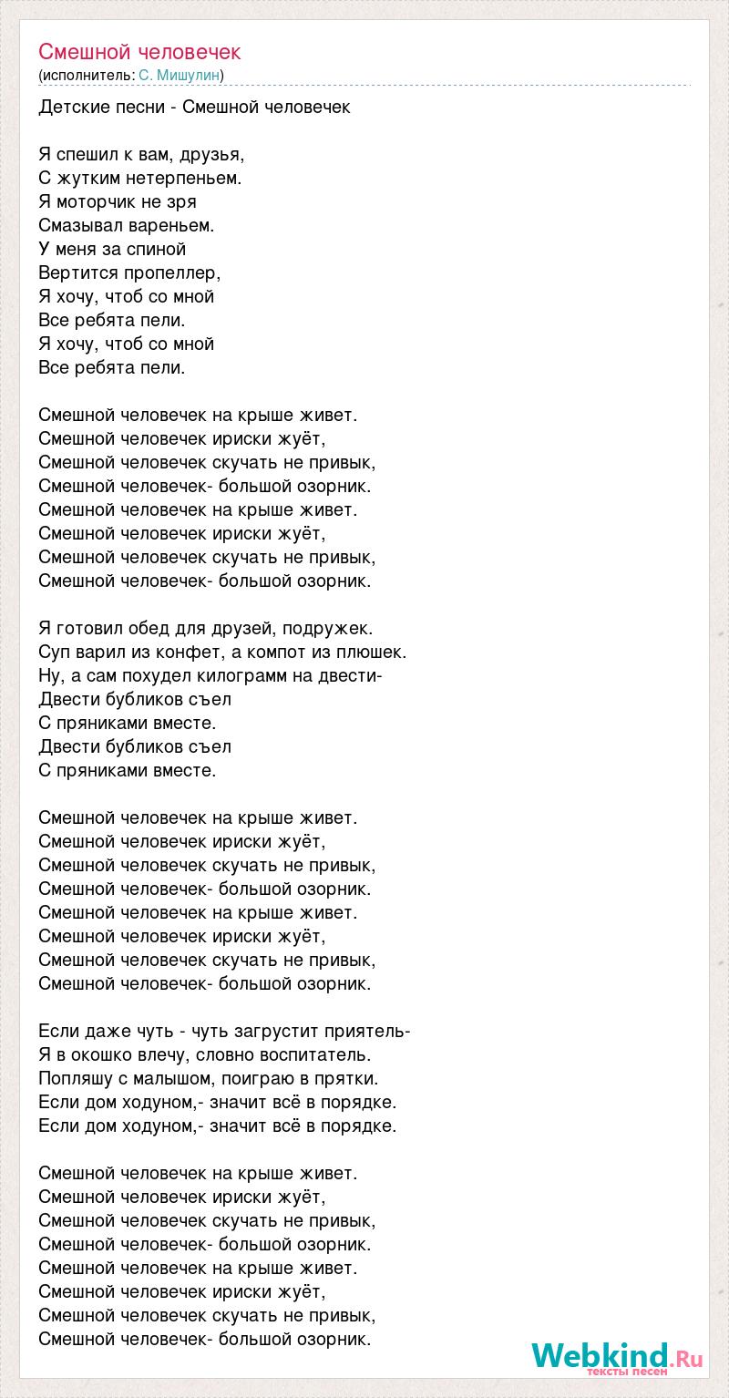 Детские песни - Смешной человечек Я спешил к вам, друзья, С жутким нетерпеньем. Я моторчик не зря Смазывал вареньем. У меня за спиной Вертится пропеллер, Я хочу, чтоб со мной Все ребята пели. Я хочу, чтоб со мной Все ребята пели. Смешной человечек на крыше живет. Смешной человечек ириски жуёт, Смешной человечек скучать не привык, Смешной человечек- большой озорник. Смешной человечек на крыше живет. Смешной человечек ириски жуёт, Смешной человечек скучать не привык, Смешной человечек- большой озорник. Я готовил обед для друзей, подружек. Суп варил из конфет, а компот из плюшек. Ну, а сам похудел килограмм на двести- Двести бубликов съел С пряниками вместе. Двести бубликов съел С пряниками вместе. Смешной человечек на крыше живет. Смешной человечек ириски жуёт, Смешной человечек скучать не привык, Смешной человечек- большой озорник. Смешной человечек на крыше живет. Смешной человечек ириски жуёт, Смешной человечек скучать не привык, Смешной человечек- большой озорник. Если даже чуть - чуть загрустит приятель- Я в окошко влечу, словно воспитатель. Попляшу с малышом, поиграю в прятки. Если дом ходуном,- значит всё в порядке. Если дом ходуном,- значит всё в порядке. Смешной человечек на крыше живет. Смешной человечек ириски жуёт, Смешной человечек скучать не привык, Смешной человечек- большой озорник. Смешной человечек на крыше живет. Смешной человечек ириски жуёт, Смешной человечек скучать не привык, Смешной человечек- большой озорник.