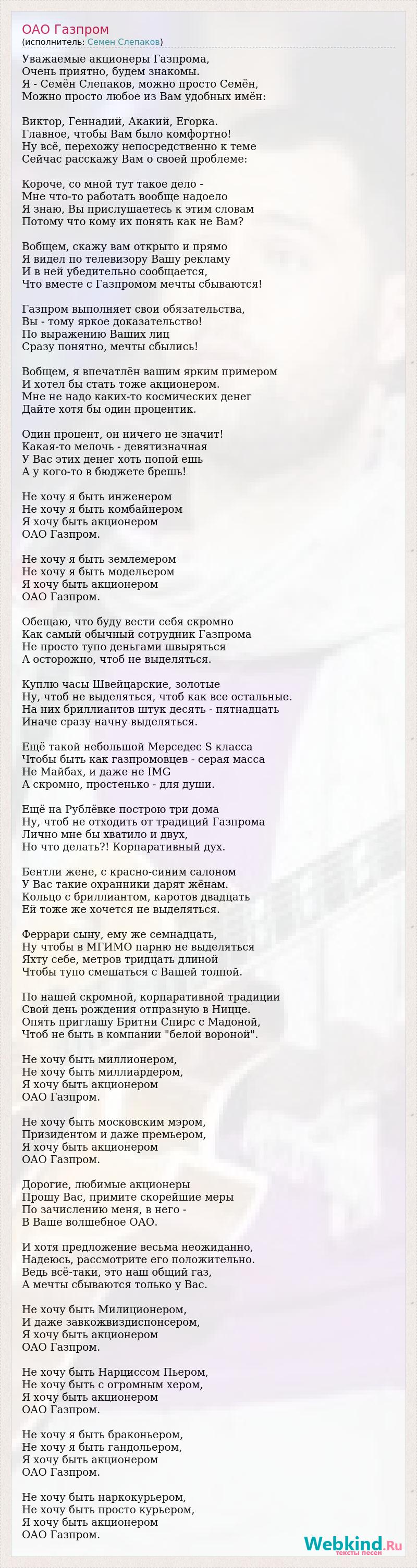 Уважаемые акционеры Газпрома, Очень приятно, будем знакомы. Я - Семён Слепаков, можно просто Семён, Можно просто любое из Вам удобных имён: Виктор, Геннадий, Акакий, Егорка. Главное, чтобы Вам было комфортно! Ну всё, перехожу непосредственно к теме Сейчас расскажу Вам о своей проблеме: Короче, со мной тут такое дело - Мне что-то работать вообще надоело Я знаю, Вы прислушаетесь к этим словам Потому что кому их понять как не Вам? Вобщем, скажу вам открыто и прямо Я видел по телевизору Вашу рекламу И в ней убедительно сообщается, Что вместе с Газпромом мечты сбываются! Газпром выполняет свои обязательства, Вы - тому яркое доказательство! По выражению Ваших лиц Сразу понятно, мечты сбылись! Вобщем, я впечатлён вашим ярким примером И хотел бы стать тоже акционером. Мне не надо каких-то космических денег Дайте хотя бы один процентик. Один процент, он ничего не значит! Какая-то мелочь - девятизначная У Вас этих денег хоть попой ешь А у кого-то в бюджете брешь! Не хочу я быть инженером Не хочу я быть комбайнером Я хочу быть акционером ОАО Газпром. Не хочу я быть землемером Не хочу я быть модельером Я хочу быть акционером ОАО Газпром. Обещаю, что буду вести себя скромно Как самый обычный сотрудник Газпрома Не просто тупо деньгами швыряться А осторожно, чтоб не выделяться. Куплю часы Швейцарские, золотые Ну, чтоб не выделяться, чтоб как все остальные. На них бриллиантов штук десять - пятнадцать Иначе сразу начну выделяться. Ещё такой небольшой Мерседес S класса Чтобы быть как газпромовцев - серая масса Не Майбах, и даже не IMG А скромно, простенько - для души. Ещё на Рублёвке построю три дома Ну, чтоб не отходить от традиций Газпрома Лично мне бы хватило и двух, Но что делать?! Корпаративный дух. Бентли жене, с красно-синим салоном У Вас такие охранники дарят жёнам. Кольцо с бриллиантом, каротов двадцать Ей тоже же хочется не выделяться. Феррари сыну, ему же семнадцать, Ну чтобы в МГИМО парню не выделяться Яхту себе, метров тридцать длиной Чтобы тупо смешаться с Вашей толпой. По нашей скромной, корпаративной традиции Свой день рождения отпразную в Ницце. Опять приглашу Бритни Спирс с Мадоной, Чтоб не быть в компании "белой вороной". Не хочу быть миллионером, Не хочу быть миллиардером, Я хочу быть акционером ОАО Газпром. Не хочу быть московским мэром, Призидентом и даже премьером, Я хочу быть акционером ОАО Газпром. Дорогие, любимые акционеры Прошу Вас, примите скорейшие меры По зачислению меня, в него - В Ваше волшебное ОАО. И хотя предложение весьма неожиданно, Надеюсь, рассмотрите его положительно. Ведь всё-таки, это наш общий газ, А мечты сбываются только у Вас. Не хочу быть Милиционером, И даже завкожвиздиспонсером, Я хочу быть акционером ОАО Газпром. Не хочу быть Нарциссом Пьером, Не хочу быть с огромным хером, Я хочу быть акционером ОАО Газпром. Не хочу я быть браконьером, Не хочу я быть гандольером, Я хочу быть акционером ОАО Газпром. Не хочу быть наркокурьером, Не хочу быть просто курьером, Я хочу быть акционером ОАО Газпром.
