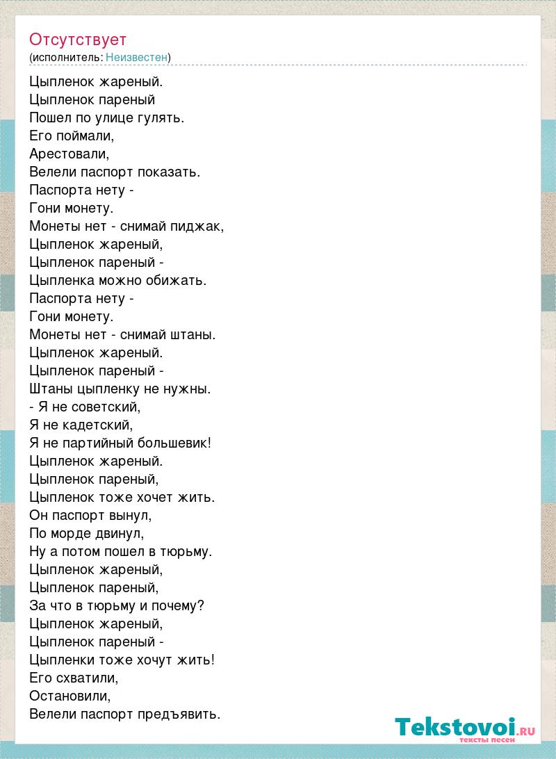 Цыпленок жареный. Цыпленок пареный Пошел по улице гулять. Его поймали, Арестовали, Велели паспорт показать. Паспорта нету - Гони монету. Монеты нет - снимай пиджак, Цыпленок жареный, Цыпленок пареный - Цыпленка можно обижать. Паспорта нету - Гони монету. Монеты нет - снимай штаны. Цыпленок жареный. Цыпленок пареный - Штаны цыпленку не нужны. - Я не советский, Я не кадетский, Я не партийный большевик! Цыпленок жареный. Цыпленок пареный, Цыпленок тоже хочет жить. Он паспорт вынул, По морде двинул, Ну а потом пошел в тюрьму. Цыпленок жареный, Цыпленок пареный, За что в тюрьму и почему? Цыпленок жареный, Цыпленок пареный - Цыпленки тоже хочут жить! Его схватили, Остановили, Велели паспорт предъявить.