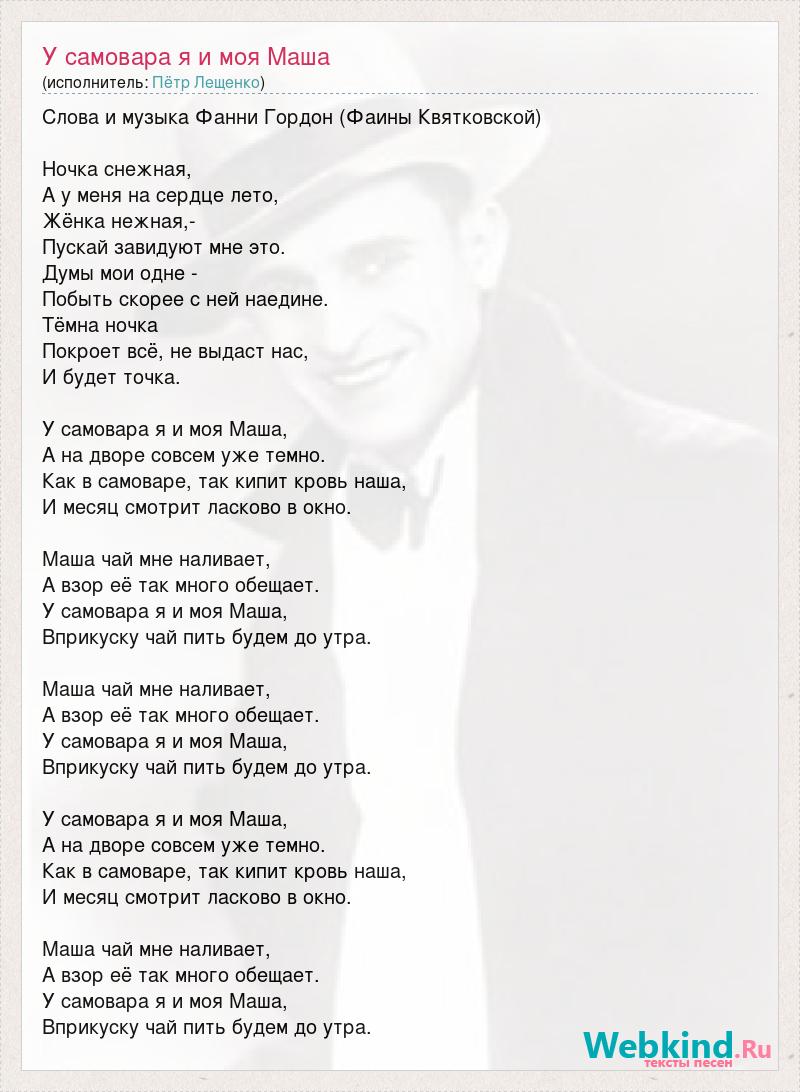 Слова и музыка Фанни Гордон (Фаины Квятковской) Ночка снежная, А у меня на сердце лето, Жёнка нежная,- Пускай завидуют мне это. Думы мои одне - Побыть скорее с ней наедине. Тёмна ночка Покроет всё, не выдаст нас, И будет точка. У самовара я и моя Маша, А на дворе совсем уже темно. Как в самоваре, так кипит кровь наша, И месяц смотрит ласково в окно. Маша чай мне наливает, А взор её так много обещает. У самовара я и моя Маша, Вприкуску чай пить будем до утра. Маша чай мне наливает, А взор её так много обещает. У самовара я и моя Маша, Вприкуску чай пить будем до утра. У самовара я и моя Маша, А на дворе совсем уже темно. Как в самоваре, так кипит кровь наша, И месяц смотрит ласково в окно. Маша чай мне наливает, А взор её так много обещает. У самовара я и моя Маша, Вприкуску чай пить будем до утра.