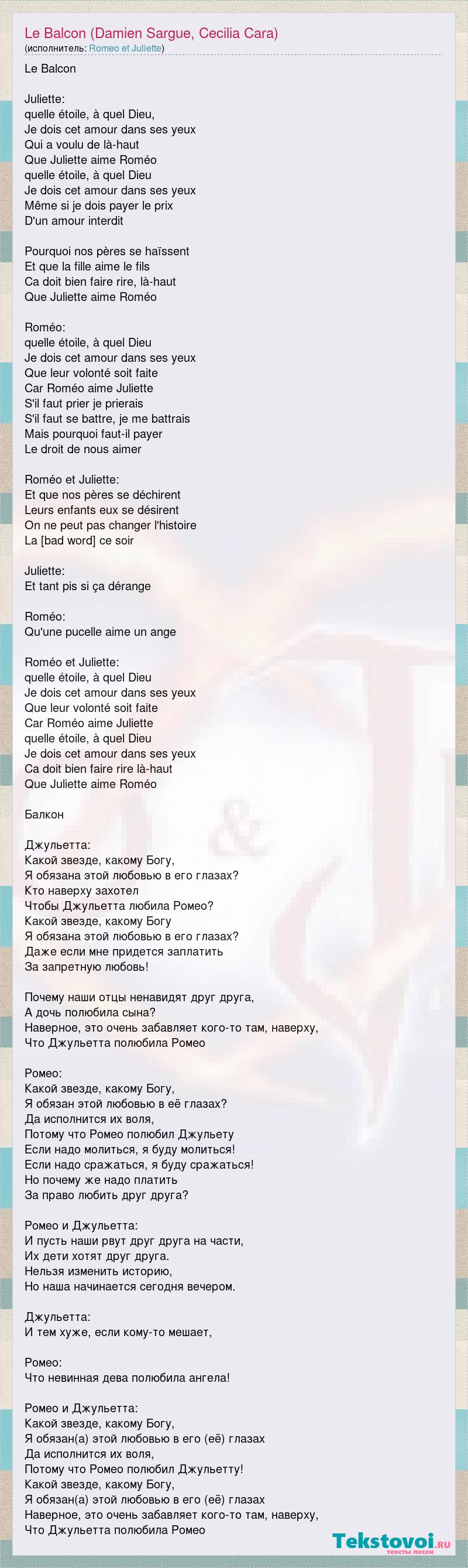 Le Balcon Juliette: quelle étoile, à quel Dieu, Je dois cet amour dans ses yeux Qui a voulu de là-haut Que Juliette aime Roméo quelle étoile, à quel Dieu Je dois cet amour dans ses yeux Même si je dois payer le prix D'un amour interdit Pourquoi nos pères se haïssent Et que la fille aime le fils Ca doit bien faire rire, là-haut Que Juliette aime Roméo Roméo: quelle étoile, à quel Dieu Je dois cet amour dans ses yeux Que leur volonté soit faite Car Roméo aime Juliette S'il faut prier je prierais S'il faut se battre, je me battrais Mais pourquoi faut-il payer Le droit de nous aimer Roméo et Juliette: Et que nos pères se déchirent Leurs enfants eux se désirent On ne peut pas changer l'histoire La nôtre commencera ce soir Juliette: Et tant pis si ça dérange Roméo: Qu'une pucelle aime un ange Roméo et Juliette: quelle étoile, à quel Dieu Je dois cet amour dans ses yeux Que leur volonté soit faite Car Roméo aime Juliette quelle étoile, à quel Dieu Je dois cet amour dans ses yeux Ca doit bien faire rire là-haut Que Juliette aime Roméo Балкон Джульетта: Какой звезде, какому Богу, Я обязана этой любовью в его глазах? Кто наверху захотел Чтобы Джульетта любила Ромео? Какой звезде, какому Богу Я обязана этой любовью в его глазах? Даже если мне придется заплатить За запретную любовь! Почему наши отцы ненавидят друг друга, А дочь полюбила сына? Наверное, это очень забавляет кого-то там, наверху, Что Джульетта полюбила Ромео Ромео: Какой звезде, какому Богу, Я обязан этой любовью в её глазах? Да исполнится их воля, Потому что Ромео полюбил Джульету Если надо молиться, я буду молиться! Если надо сражаться, я буду сражаться! Но почему же надо платить За право любить друг друга? Ромео и Джульетта: И пусть наши рвут друг друга на части, Их дети хотят друг друга. Нельзя изменить историю, Но наша начинается сегодня вечером. Джульетта: И тем хуже, если кому-то мешает, Ромео: Что невинная дева полюбила ангела! Ромео и Джульетта: Какой звезде, какому Богу, Я обязан(а) этой любовью в его (её) глазах Да исполнится их воля, Потому что Ромео полюбил Джульетту! Какой звезде, какому Богу, Я обязан(а) этой любовью в его (её) глазах Наверное, это очень забавляет кого-то там, наверху, Что Джульетта полюбила Ромео