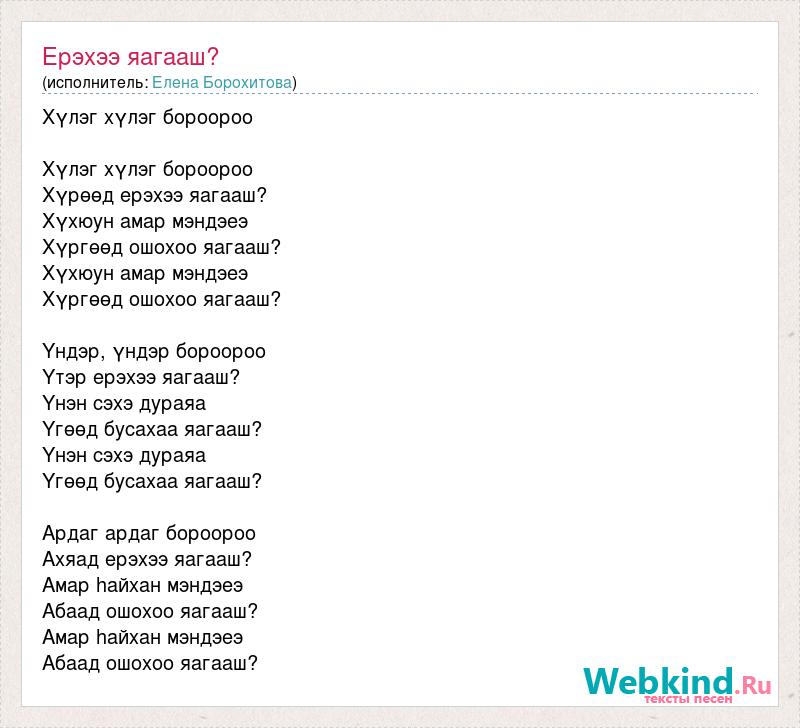 Хүлэг хүлэг бороороо Хүлэг хүлэг бороороо Хүрөөд ерэхээ яагааш? Хүхюун амар мэндэеэ Хүргөөд ошохоо яагааш? Хүхюун амар мэндэеэ Хүргөөд ошохоо яагааш? Үндэр, үндэр бороороо Үтэр ерэхээ яагааш? Үнэн сэхэ дураяа Үгөөд бусахаа яагааш? Үнэн сэхэ дураяа Үгөөд бусахаа яагааш? Ардаг ардаг бороороо Ахяад ерэхээ яагааш? Амар hайхан мэндэеэ Абаад ошохоо яагааш? Амар hайхан мэндэеэ Абаад ошохоо яагааш?