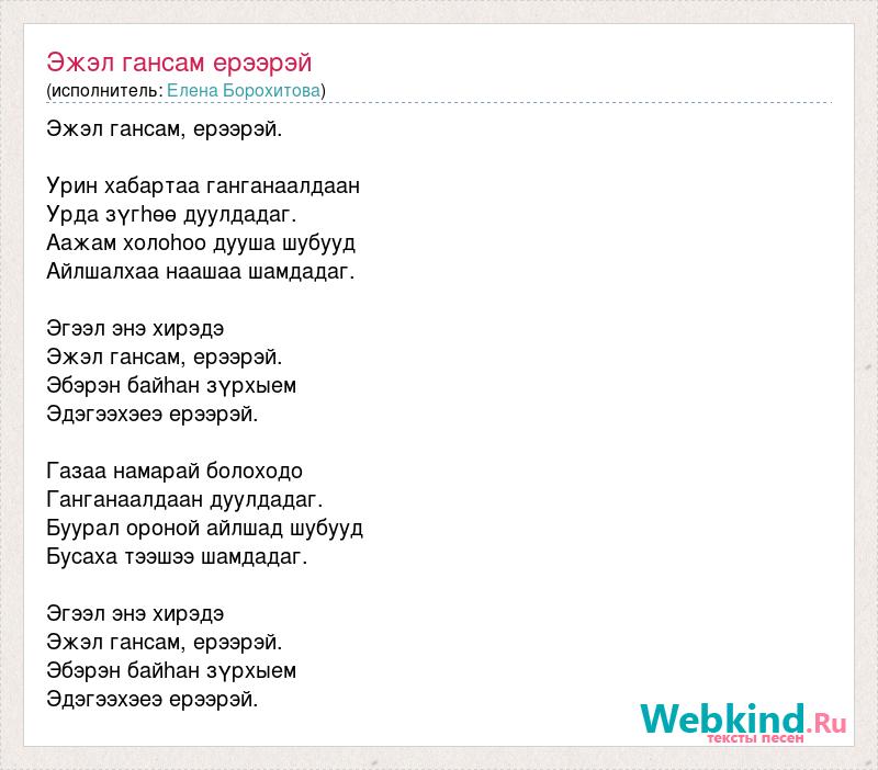 Эжэл гансам, ерээрэй. Урин хабартаа ганганаалдаан Урда зүгhөө дуулдадаг. Аажам холоhоо дууша шубууд Айлшалхаа наашаа шамдадаг. Эгээл энэ хирэдэ Эжэл гансам, ерээрэй. Эбэрэн байhан зүрхыем Эдэгээхэеэ ерээрэй. Газаа намарай болоходо Ганганаалдаан дуулдадаг. Буурал ороной айлшад шубууд Бусаха тээшээ шамдадаг. Эгээл энэ хирэдэ Эжэл гансам, ерээрэй. Эбэрэн байhан зүрхыем Эдэгээхэеэ ерээрэй.