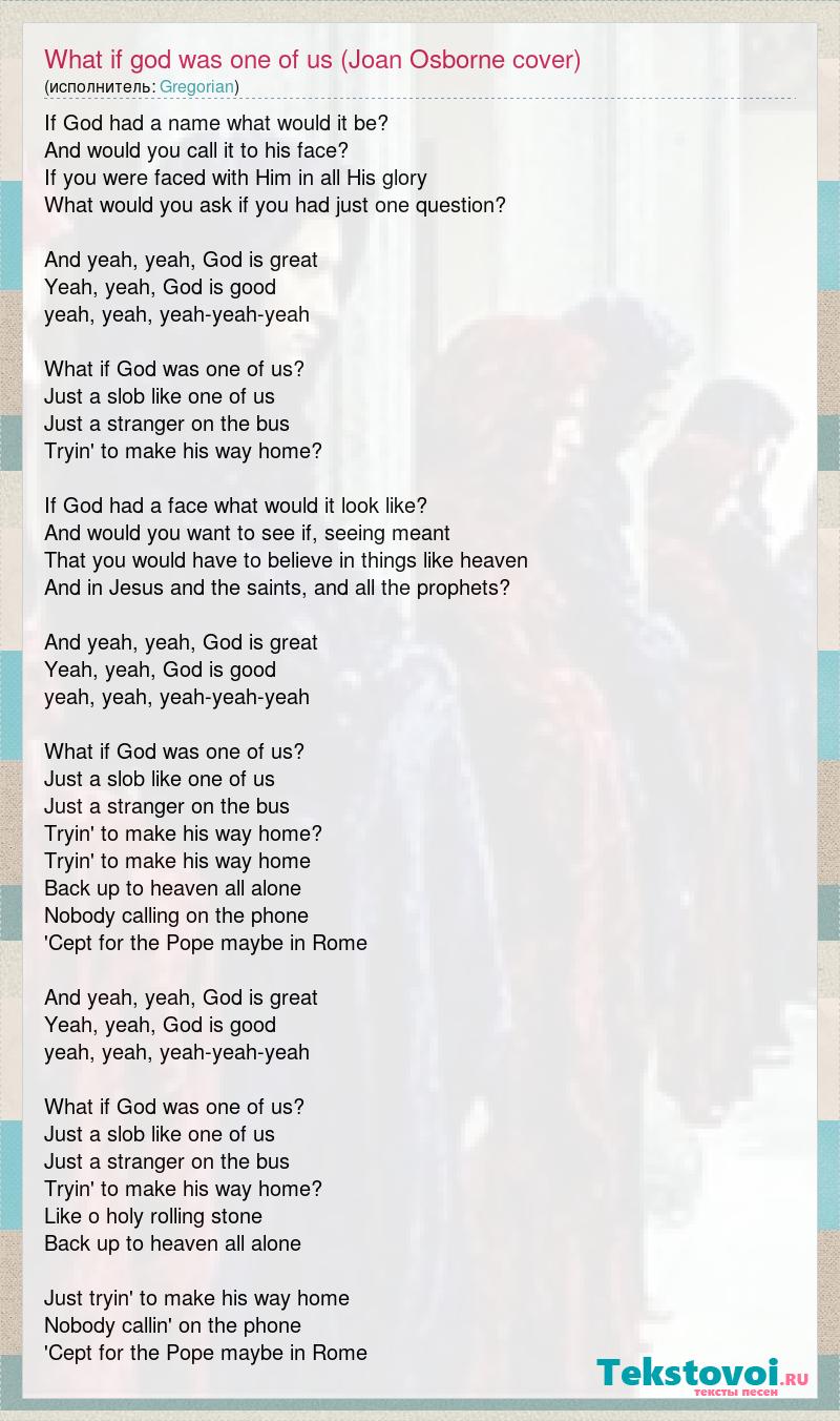 If God had a name what would it be? And would you call it to his face? If you were faced with Him in all His glory What would you ask if you had just one question? And yeah, yeah, God is great Yeah, yeah, God is good yeah, yeah, yeah-yeah-yeah What if God was one of us? Just a slob like one of us Just a stranger on the bus Tryin' to make his way home? If God had a face what would it look like? And would you want to see if, seeing meant That you would have to believe in things like heaven And in Jesus and the saints, and all the prophets? And yeah, yeah, God is great Yeah, yeah, God is good yeah, yeah, yeah-yeah-yeah What if God was one of us? Just a slob like one of us Just a stranger on the bus Tryin' to make his way home? Tryin' to make his way home Back up to heaven all alone Nobody calling on the phone 'Cept for the Pope maybe in Rome And yeah, yeah, God is great Yeah, yeah, God is good yeah, yeah, yeah-yeah-yeah What if God was one of us? Just a slob like one of us Just a stranger on the bus Tryin' to make his way home? Like o holy rolling stone Back up to heaven all alone Just tryin' to make his way home Nobody callin' on the phone 'Cept for the Pope maybe in Rome