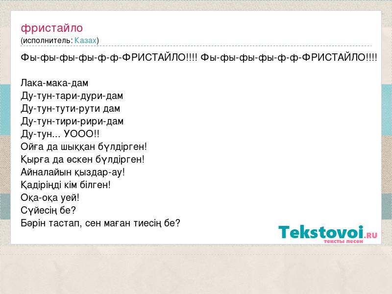 Фы-фы-фы-фы-ф-ф-ФРИСТАЙЛО!!!! Фы-фы-фы-фы-ф-ф-ФРИСТАЙЛО!!!! Лака-мака-дам Ду-тун-тари-дури-дам Ду-тун-тути-рути дам Ду-тун-тири-рири-дам Ду-тун... УООО!! Ойға да шыққан бүлдірген! Қырға да өскен бүлдірген! Айналайын қыздар-ау! Қадіріңді кім білген! Оқа-оқа уей! Сүйесің бе? Бәрін тастап, сен маған тиесің бе?