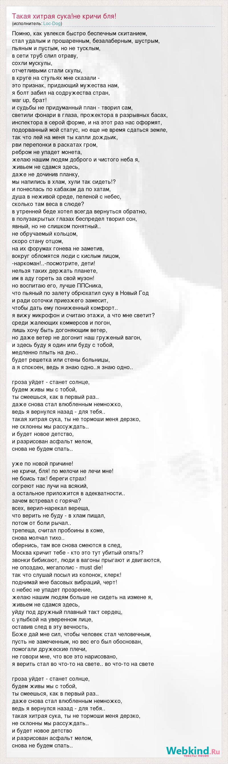 Помню, как увлекся быстро беспечным скитанием, стал удалым и прошаренным, безалаберным, шустрым, пьяным и пустым, но не тусклым, в сети труб слил отраву, сохли мускулы, отчетливыми стали скулы, в круге на стульях мне сказали - это признак, придающий мужества нам, я болт забил на содружества стран, war up, брат! и судьбы не придуманный план - творил сам, светили фонари в глаза, прожектора в разрывных басах, инспектора в серой форме, и на этот раз нас оформят, подорванный мой статус, но еще не время сдаться земле, так что лей на меня ты капли дождьик, рви перепонки в раскатах гром, ребром не упадет монета, желаю нашим людям доброго и чистого неба я, живьем не сдамся здесь, даже не дочинив планку, мы напились в хлам, хули так сидеть!? и понеслась по кабакам да по хатам, душа в неживой среде, пеленой с небес, сколько там веса в слюде? в утренней беде хотел всегда вернуться обратно, в полузакрытых глазах беспредел творил сон, явный, но не слишком понятный.. не обручаемый кольцом, скоро стану отцом, на их форумах гонева не заметив, вокруг обломятся люди с кислым лицом, -наркоман!..-посмотрите, дети! нельзя таких держать планете, им в аду гореть за свой музон! но воспитаю его, лучше ППСника, что пьяный по залету обрюхатил суку в Новый Год и ради соточки приезжего замесит, чтобы дать ему пониженный комфорт.. я вижу микрофон и считаю этажи, а что мне светит? среди жалеющих коммерсов и погон, лишь хочу быть догоняющим ветер, но даже ветер не догонит наш груженый вагон, и здесь буду я один или буду с тобой, медленно плыть на дно.. будет решетка или стены больницы, а я спокоен, ведь я знаю одно..я знаю одно.. гроза уйдет - станет солнце, будем живы мы с тобой, ты смеешься, как в первый раз.. даже снова стал влюбленным немножко, ведь я вернулся назад - для тебя.. такая хитрая сука, ты не тормоши меня дерзко, не склонны мы рассуждать.. и будет новое детство, и разрисован асфальт мелом, снова не будем спать.. уже по новой причине! не кричи, бля! по мелочи не лечи мне! не боись так! береги страх! согреют нас лучи на всякий, а остальное приложится в адекватности.. зачем встревал с горяча? всех, верил-нарекал вереща, что верить не буду - в хлам пищал, потом от боли рычал.. трепеща, считал пробоины в коме, снова молчал тихо.. обернись, там все снова смеются в след, Москва кричит тебе - кто это тут убитый опять!? звонки бибикают, люди в вагоны прыгают и двигаются, не опоздаю, мегаполис - must die! так что слушай посыл из колонок, клерк! поднимай мне басовых вибраций, черт! с небес не упадет прозрение, желаю нашим людям больше не сидеть на измене я, живьем не сдамся здесь, уйду под дружный плавный такт сердец, с улыбкой на уверенном лице, оставив след в эту вечность, Боже дай мне сил, чтобы человек стал человечным, пусть не замеченным, но вес его был обоснован, помогали дружеские плечи, не говори мне, что все это нарисовано, я верить стал во что-то на свете.. во что-то на свете гроза уйдет - станет солнце, будем живы мы с тобой, ты смеешься, как в первый раз.. даже снова стал влюбленным немножко, ведь я вернулся назад - для тебя.. такая хитрая сука, ты не тормоши меня дерзко, не склонны мы рассуждать.. и будет новое детство и разрисован асфальт мелом, снова не будем спать..