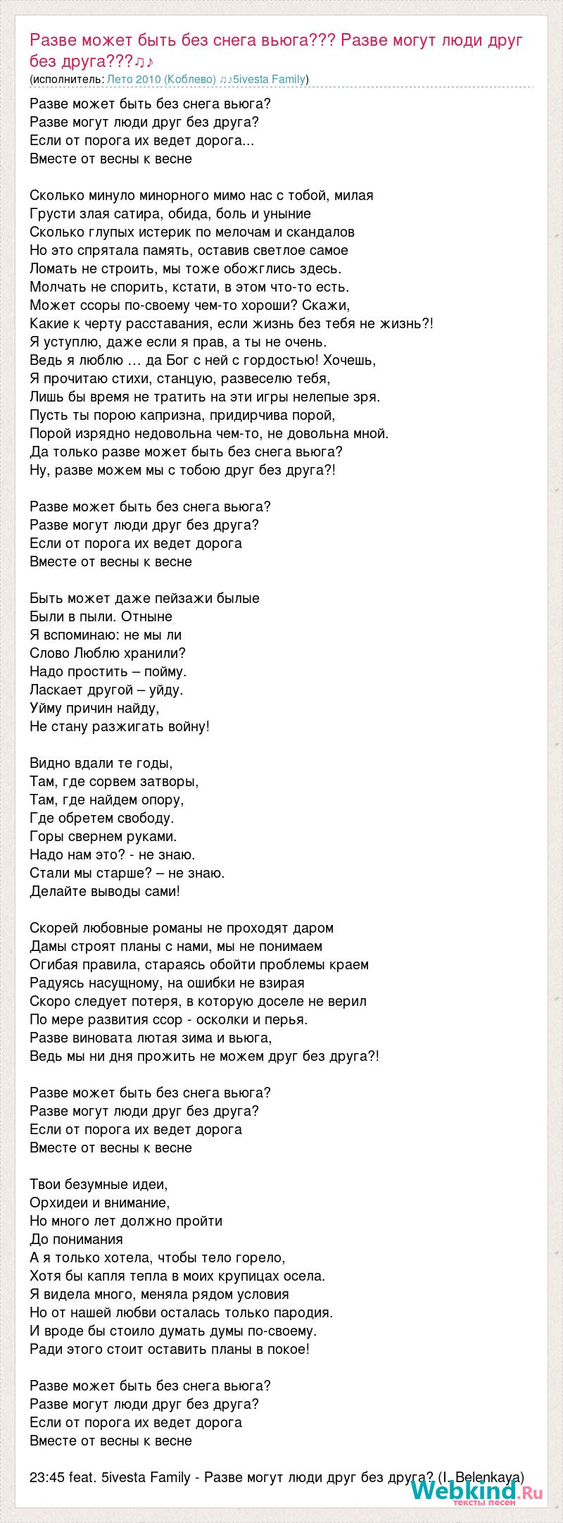 Разве может быть без снега вьюга? Разве могут люди друг без друга? Если от порога их ведет дорога... Вместе от весны к весне Сколько минуло минорного мимо нас с тобой, милая Грусти злая сатира, обида, боль и уныние Сколько глупых истерик по мелочам и скандалов Но это спрятала память, оставив светлое самое Ломать не строить, мы тоже обожглись здесь. Молчать не спорить, кстати, в этом что-то есть. Может ссоры по-своему чем-то хороши? Скажи, Какие к черту расставания, если жизнь без тебя не жизнь?! Я уступлю, даже если я прав, а ты не очень. Ведь я люблю … да Бог с ней с гордостью! Хочешь, Я прочитаю стихи, станцую, развеселю тебя, Лишь бы время не тратить на эти игры нелепые зря. Пусть ты порою капризна, придирчива порой, Порой изрядно недовольна чем-то, не довольна мной. Да только разве может быть без снега вьюга? Ну, разве можем мы с тобою друг без друга?! Разве может быть без снега вьюга? Разве могут люди друг без друга? Если от порога их ведет дорога Вместе от весны к весне Быть может даже пейзажи былые Были в пыли. Отныне Я вспоминаю: не мы ли Слово Люблю хранили? Надо простить – пойму. Ласкает другой – уйду. Уйму причин найду, Не стану разжигать войну! Видно вдали те годы, Там, где сорвем затворы, Там, где найдем опору, Где обретем свободу. Горы свернем руками. Надо нам это? - не знаю. Стали мы старше? – не знаю. Делайте выводы сами! Скорей любовные романы не проходят даром Дамы строят планы с нами, мы не понимаем Огибая правила, стараясь обойти проблемы краем Радуясь насущному, на ошибки не взирая Скоро следует потеря, в которую доселе не верил По мере развития ссор - осколки и перья. Разве виновата лютая зима и вьюга, Ведь мы ни дня прожить не можем друг без друга?! Разве может быть без снега вьюга? Разве могут люди друг без друга? Если от порога их ведет дорога Вместе от весны к весне Твои безумные идеи, Орхидеи и внимание, Но много лет должно пройти До понимания А я только хотела, чтобы тело горело, Хотя бы капля тепла в моих крупицах осела. Я видела много, меняла рядом условия Но от нашей любви осталась только пародия. И вроде бы стоило думать думы по-своему. Ради этого стоит оставить планы в покое! Разве может быть без снега вьюга? Разве могут люди друг без друга? Если от порога их ведет дорога Вместе от весны к весне 23:45 feat. 5ivesta Family - Разве могут люди друг без друга? (I. Belenkaya)