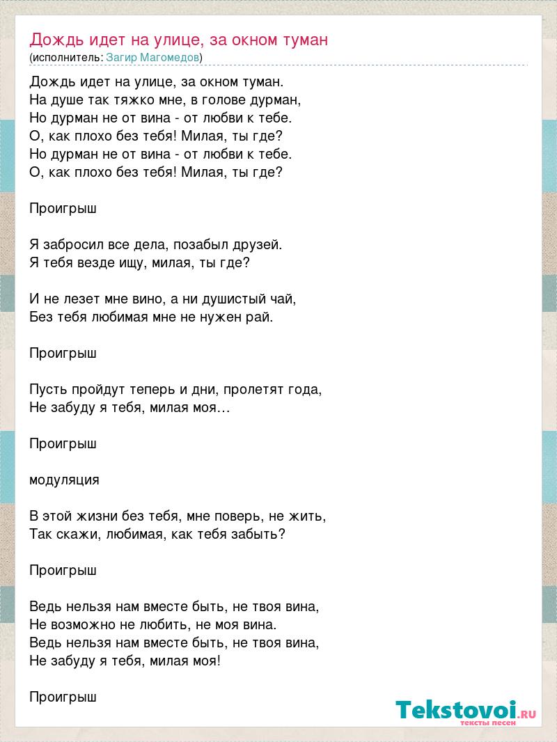 Дождь идет на улице, за окном туман. На душе так тяжко мне, в голове дурман, Но дурман не от вина - от любви к тебе. О, как плохо без тебя! Милая, ты где? Но дурман не от вина - от любви к тебе. О, как плохо без тебя! Милая, ты где? Проигрыш Я забросил все дела, позабыл друзей. Я тебя везде ищу, милая, ты где? И не лезет мне вино, а ни душистый чай, Без тебя любимая мне не нужен рай. Проигрыш Пусть пройдут теперь и дни, пролетят года, Не забуду я тебя, милая моя… Проигрыш модуляция В этой жизни без тебя, мне поверь, не жить, Так скажи, любимая, как тебя забыть? Проигрыш Ведь нельзя нам вместе быть, не твоя вина, Не возможно не любить, не моя вина. Ведь нельзя нам вместе быть, не твоя вина, Не забуду я тебя, милая моя! Проигрыш