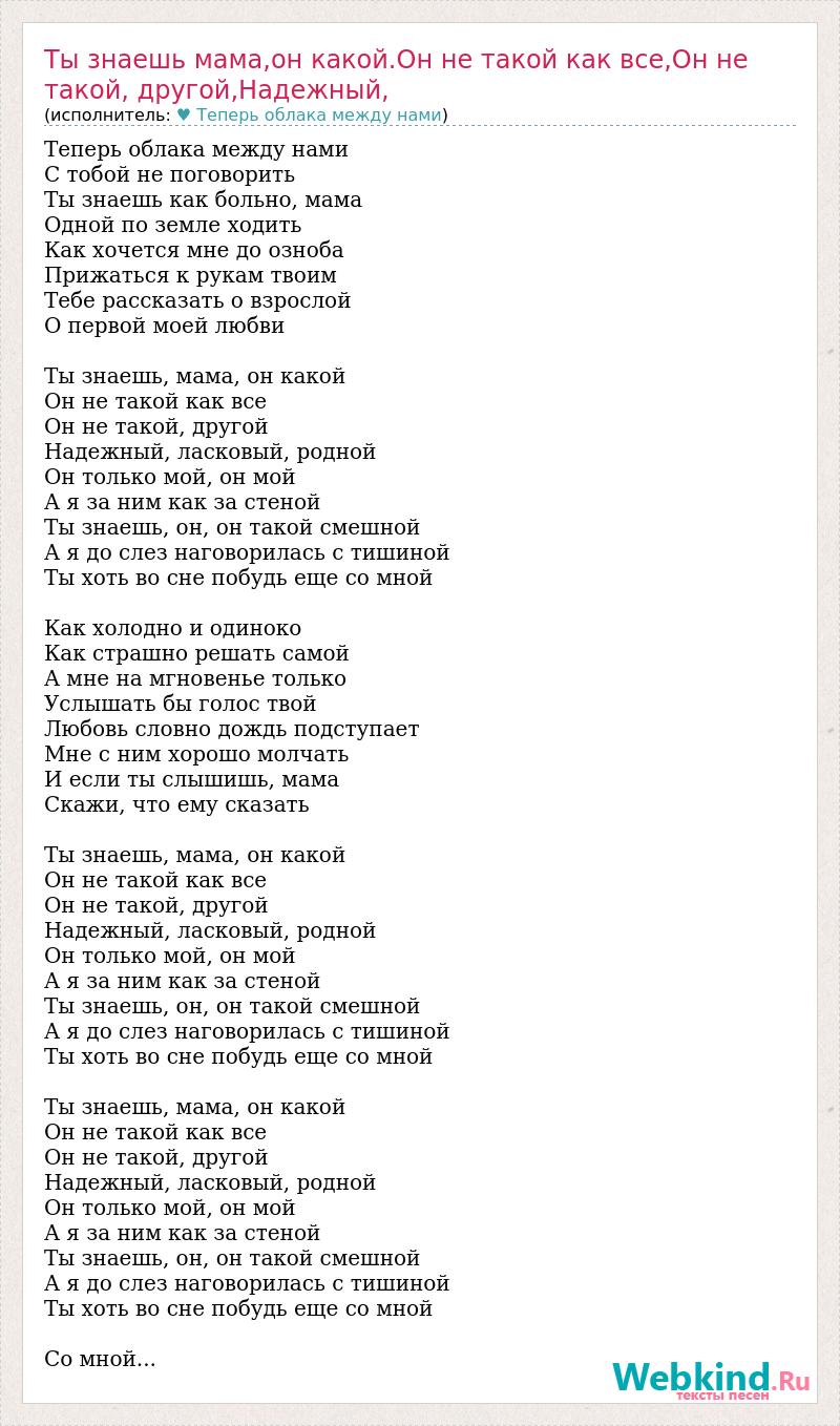Ты знаешь мама,он какой.Он не такой как все,Он не такой, другой,Надежн
