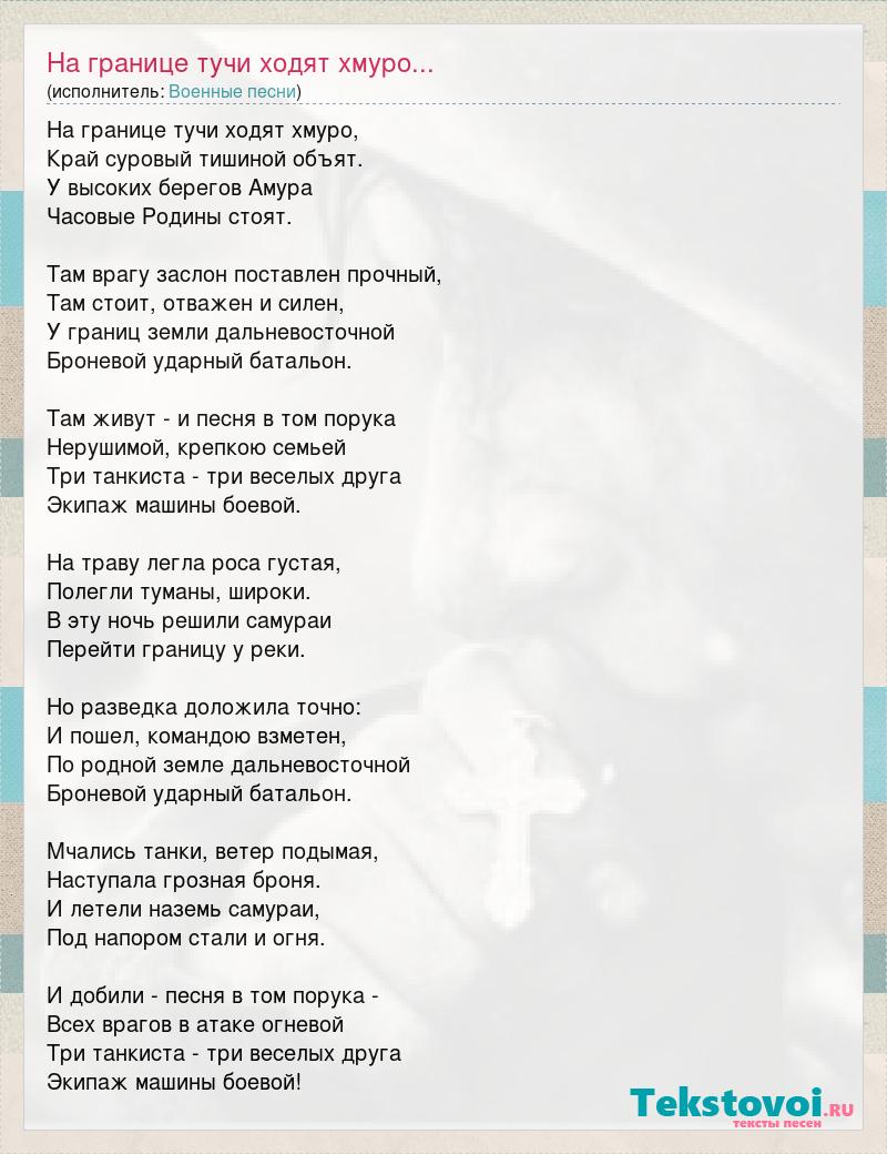 На границе тучи ходят хмуро, Край суровый тишиной объят. У высоких берегов Амура Часовые Родины стоят. Там врагу заслон поставлен прочный, Там стоит, отважен и силен, У границ земли дальневосточной Броневой ударный батальон. Там живут - и песня в том порука Нерушимой, крепкою семьей Три танкиста - три веселых друга Экипаж машины боевой. На траву легла роса густая, Полегли туманы, широки. В эту ночь решили самураи Перейти границу у реки. Но разведка доложила точно: И пошел, командою взметен, По родной земле дальневосточной Броневой ударный батальон. Мчались танки, ветер подымая, Наступала грозная броня. И летели наземь самураи, Под напором стали и огня. И добили - песня в том порука - Всех врагов в атаке огневой Три танкиста - три веселых друга Экипаж машины боевой!