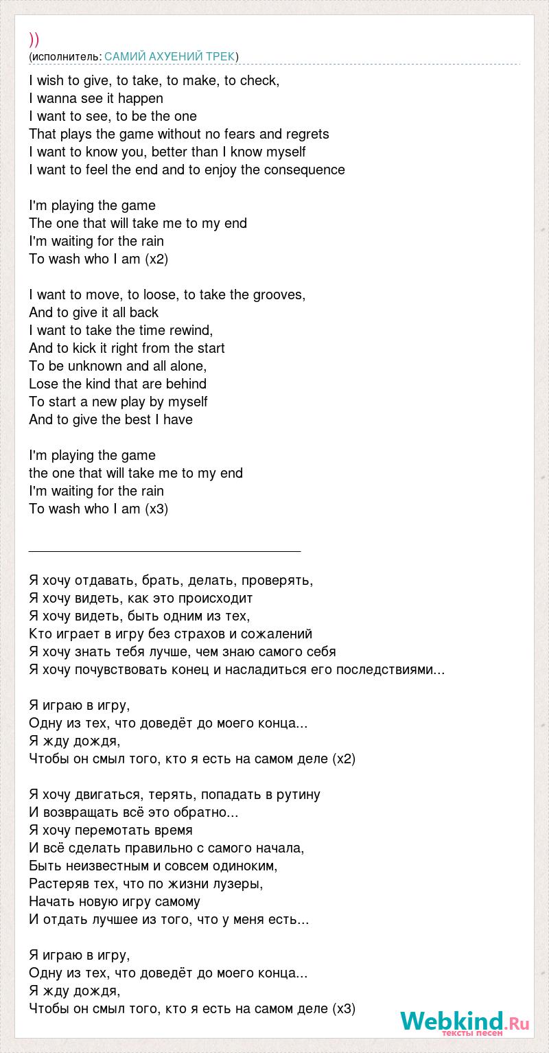 I wish to give, to take, to make, to check, I wanna see it happen I want to see, to be the one That plays the game without no fears and regrets I want to know you, better than I know myself I want to feel the end and to enjoy the consequence I'm playing the game The one that will take me to my end I'm waiting for the rain To wash who I am (x2) I want to move, to loose, to take the grooves, And to give it all back I want to take the time rewind, And to kick it right from the start To be unknown and all alone, Lose the kind that are behind To start a new play by myself And to give the best I have I'm playing the game the one that will take me to my end I'm waiting for the rain To wash who I am (x3) ____________________________________ Я хочу отдавать, брать, делать, проверять, Я хочу видеть, как это происходит Я хочу видеть, быть одним из тех, Кто играет в игру без страхов и сожалений Я хочу знать тебя лучше, чем знаю самого себя Я хочу почувствовать конец и насладиться его последствиями... Я играю в игру, Одну из тех, что доведёт до моего конца... Я жду дождя, Чтобы он смыл того, кто я есть на самом деле (x2) Я хочу двигаться, терять, попадать в рутину И возвращать всё это обратно... Я хочу перемотать время И всё сделать правильно с самого начала, Быть неизвестным и совсем одиноким, Растеряв тех, что по жизни лузеры, Начать новую игру самому И отдать лучшее из того, что у меня есть... Я играю в игру, Одну из тех, что доведёт до моего конца... Я жду дождя, Чтобы он смыл того, кто я есть на самом деле (x3)