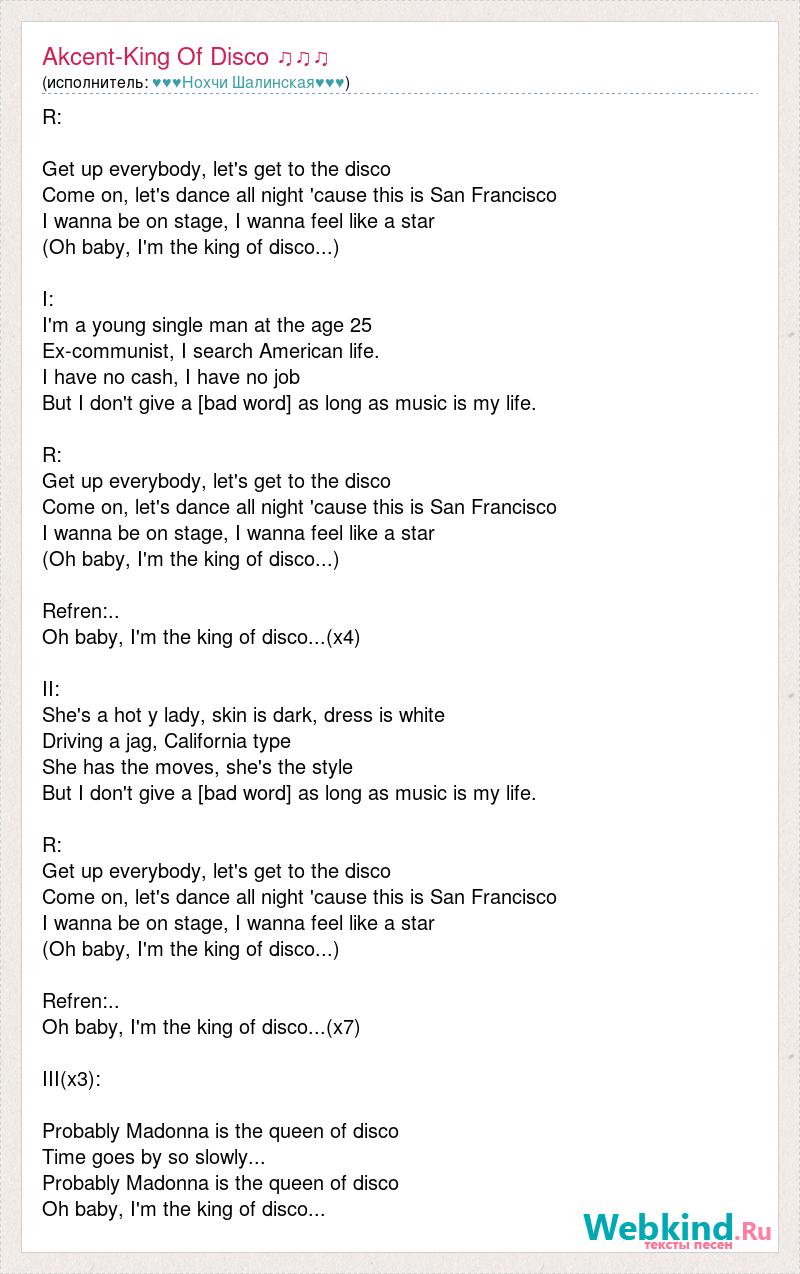 R: Get up everybody, let's get to the disco Come on, let's dance all night 'cause this is San Francisco I wanna be on stage, I wanna feel like a star (Oh baby, I'm the king of disco...) I: I'm a young single man at the age 25 Ex-communist, I search American life. I have no cash, I have no job But I don't give a [bad word] as long as music is my life. R: Get up everybody, let's get to the disco Come on, let's dance all night 'cause this is San Francisco I wanna be on stage, I wanna feel like a star (Oh baby, I'm the king of disco...) Refren:.. Oh baby, I'm the king of disco...(x4) II: She's a hot y lady, skin is dark, dress is white Driving a jag, California type She has the moves, she's the style But I don't give a [bad word] as long as music is my life. R: Get up everybody, let's get to the disco Come on, let's dance all night 'cause this is San Francisco I wanna be on stage, I wanna feel like a star (Oh baby, I'm the king of disco...) Refren:.. Oh baby, I'm the king of disco...(x7) III(x3): Probably Madonna is the queen of disco Time goes by so slowly... Probably Madonna is the queen of disco Oh baby, I'm the king of disco...