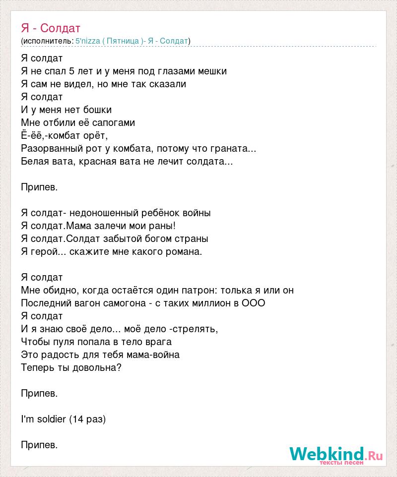 Я солдат Я не спал 5 лет и у меня под глазами мешки Я сам не видел, но мне так сказали Я солдат И у меня нет бошки Мне отбили её сапогами Ё-ёё,-комбат орёт, Разорванный рот у комбата, потому что граната... Белая вата, красная вата не лечит солдата... Припев. Я солдат- недоношенный ребёнок войны Я солдат.Мама залечи мои раны! Я солдат.Солдат забытой богом страны Я герой... скажите мне какого романа. Я солдат Мне обидно, когда остаётся один патрон: толька я или он Последний вагон самогона - с таких миллион в ООО Я солдат И я знаю своё дело... моё дело -стрелять, Чтобы пуля попала в тело врага Это радость для тебя мама-война Теперь ты довольна? Припев. I'm soldier (14 раз) Припев.