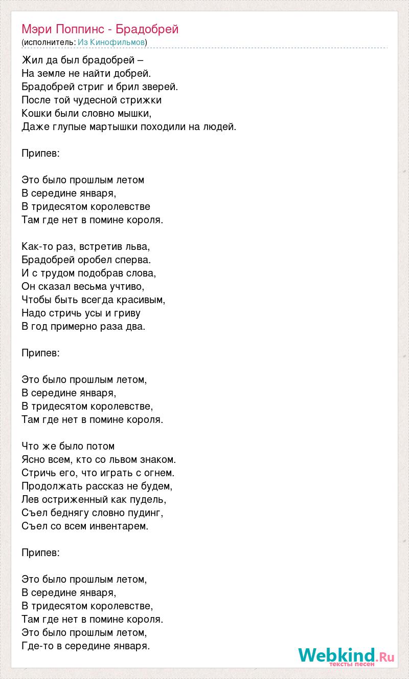 Жил да был брадобрей – На земле не найти добрей. Брадобрей стриг и брил зверей. После той чудесной стрижки Кошки были словно мышки, Даже глупые мартышки походили на людей. Припев: Это было прошлым летом В середине января, В тридесятом королевстве Там где нет в помине короля. Как-то раз, встретив льва, Брадобрей оробел сперва. И с трудом подобрав слова, Он сказал весьма учтиво, Чтобы быть всегда красивым, Надо стричь усы и гриву В год примерно раза два. Припев: Это было прошлым летом, В середине января, В тридесятом королевстве, Там где нет в помине короля. Что же было потом Ясно всем, кто со львом знаком. Стричь его, что играть с огнем. Продолжать рассказ не будем, Лев остриженный как пудель, Съел беднягу словно пудинг, Съел со всем инвентарем. Припев: Это было прошлым летом, В середине января, В тридесятом королевстве, Там где нет в помине короля. Это было прошлым летом, Где-то в середине января.