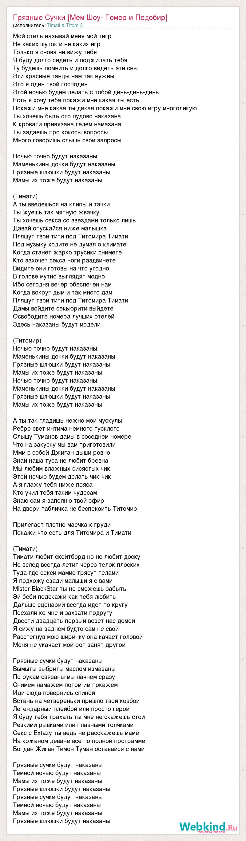 Мой стиль называй меня мой тигр Не каких шуток и не каких игр Только я снова не вижу тебя Я буду долго сидеть и поджидать тебя Ту будешь помнить и долго видеть эти сны Эти красные танцы нам так нужны Это я один твой господин Этой ночью будем делать с тобой динь-динь-динь Есть я хочу тебя покажи мне какая ты есть Покажи мне какая ты дикая покажи мне свою игру многоликую Ты хочешь быть сто пудово наказана К кровати привязана гелем намазана Ты задаешь про кокосы вопросы Много говоришь слышь свои запросы Ночью точно будут наказаны Маменькины дочки будут наказаны Грязные шлюшки будут наказаны Мамы их тоже будут наказаны (Тимати) А ты введешься на клипы и тачки Ты жуешь так мятную жвачку Ты хочешь секса со звездами только лишь Давай опускайся ниже малышка Пляшут твои тити под Титомира Тимати Под музыку ходите не думая о климате Когда станет жарко трусики снимете Кто захочет секса ноги раздвинете Видите они готовы на что угодно В голове мутно выглядят модно Ибо сегодня вечер обеспечен нам Когда вокруг дым и так много дам Пляшут твои тити под Титомира Тимати Дамы войдите секьюрити выйдете Освободите номера лучших отелей Здесь наказаны будут модели (Титомир) Ночью точно будут наказаны Маменькины дочки будут наказаны Грязные шлюшки будут наказаны Мамы их тоже будут наказаны Ночью точно будут наказаны Маменькины дочки будут наказаны Грязные шлюшки будут наказаны Мамы их тоже будут наказаны А ты так гладишь нежно мои мускулы Ребро свет интима немного тусклого Слышу Туманов дамы в соседнем номере Что на закуску мы вам приготовили Ммм с собой Джиган дыши ровно Знай наша туса не любит бревна Мы любим влажных сисястых чик Этой ночью будем делать чик-чик А я глажу тебя ниже пояса Кто учил тебя таким чудесам Знаю сам я заполню твой эфир На двери табличка не беспокоить Титомир Прилегает плотно маечка к груди Покажи что есть для Титомира и Тимати (Тимати) Тимати любит скейтборд но не любит доску Но вслед всегда летит через телок плоских Туда где секси мамис трясут телами Я подхожу сзади малыши я с вами Mister BlackStar ты не сможешь забыть Эй беби подскажи как тебя любить Дальше сценарий всегда идет по кругу Поехали ко мне и захвати подругу Двести двадцать первый везет нас домой Я сижу на заднем будто сам не свой Расстегнув мою ширинку она качает головой Меня не укачает мой рот занят другой Грязные сучки будут наказаны Вымыты выбриты маслом измазаны По рукам связаны мы начнем сразу Снимем намажем потом им покажем Иди сюда повернись спиной Встань на четвереньки пришло твой ковбой Легендарный плейбой или просто герой Я буду тебя трахать ты мне не скажешь стой Резкими рывками или плавными толчками Секс с Extazy ты ведь не расскажешь маме На кожаном деване все по полной программе Богдан Жиган Тимон Туман оставайся с нами Грязные сучки будут наказаны Темной ночью будут наказаны Мамы их тоже будут наказаны Грязные шлюшки будут наказаны Грязные сучки будут наказаны Темной ночью будут наказаны Мамы их тоже будут наказаны Грязные шлюшки будут наказаны