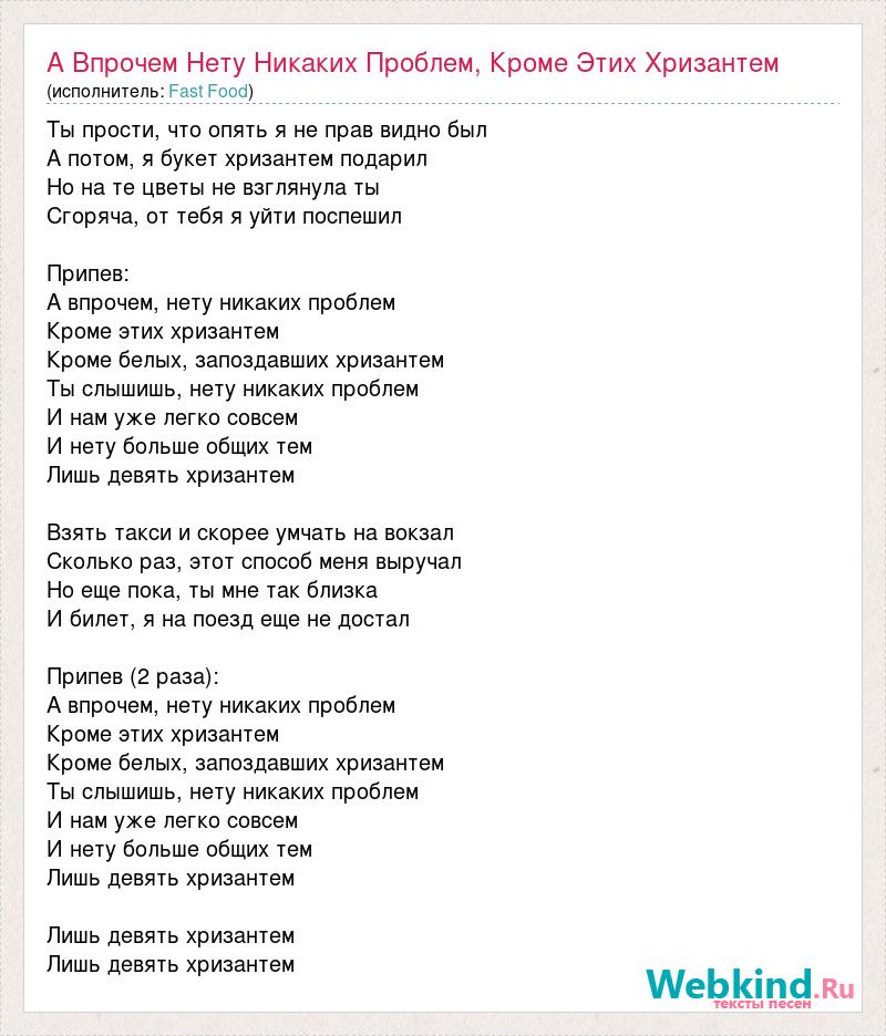 Ты прости, что опять я не прав видно был А потом, я букет хризантем подарил Но на те цветы не взглянула ты Сгоряча, от тебя я уйти поспешил Припев: А впрочем, нету никаких проблем Кроме этих хризантем Кроме белых, запоздавших хризантем Ты слышишь, нету никаких проблем И нам уже легко совсем И нету больше общих тем Лишь девять хризантем Взять такси и скорее умчать на вокзал Сколько раз, этот способ меня выручал Но еще пока, ты мне так близка И билет, я на поезд еще не достал Припев (2 раза): А впрочем, нету никаких проблем Кроме этих хризантем Кроме белых, запоздавших хризантем Ты слышишь, нету никаких проблем И нам уже легко совсем И нету больше общих тем Лишь девять хризантем Лишь девять хризантем Лишь девять хризантем
