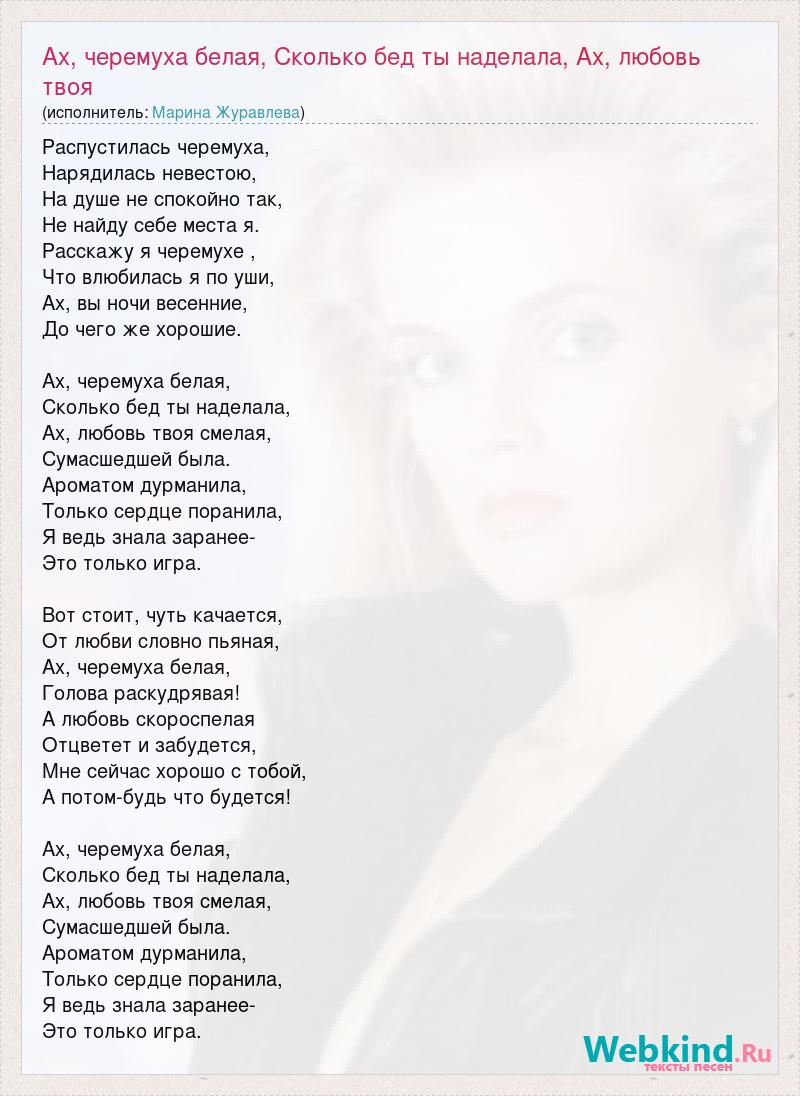 Распустилась черемуха, Нарядилась невестою, На душе не спокойно так, Не найду себе места я. Расскажу я черемухе , Что влюбилась я по уши, Ах, вы ночи весенние, До чего же хорошие. Ах, черемуха белая, Сколько бед ты наделала, Ах, любовь твоя смелая, Сумасшедшей была. Ароматом дурманила, Только сердце поранила, Я ведь знала заранее- Это только игра. Вот стоит, чуть качается, От любви словно пьяная, Ах, черемуха белая, Голова раскудрявая! А любовь скороспелая Отцветет и забудется, Мне сейчас хорошо с тобой, А потом-будь что будется! Ах, черемуха белая, Сколько бед ты наделала, Ах, любовь твоя смелая, Сумасшедшей была. Ароматом дурманила, Только сердце поранила, Я ведь знала заранее- Это только игра.