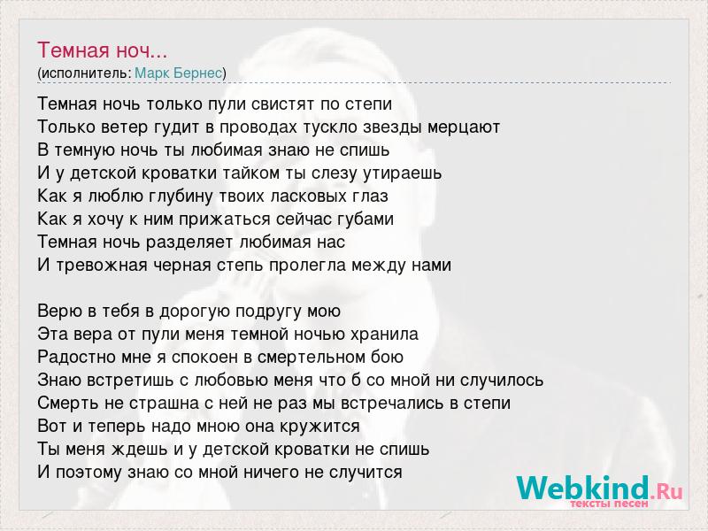 Темная ночь только пули свистят по степи Только ветер гудит в проводах тускло звезды мерцают В темную ночь ты любимая знаю не спишь И у детской кроватки тайком ты слезу утираешь Как я люблю глубину твоих ласковых глаз Как я хочу к ним прижаться сейчас губами Темная ночь разделяет любимая нас И тревожная черная степь пролегла между нами Верю в тебя в дорогую подругу мою Эта вера от пули меня темной ночью хранила Радостно мне я спокоен в смертельном бою Знаю встретишь с любовью меня что б со мной ни случилось Смерть не страшна с ней не раз мы встречались в степи Вот и теперь надо мною она кружится Ты меня ждешь и у детской кроватки не спишь И поэтому знаю со мной ничего не случится