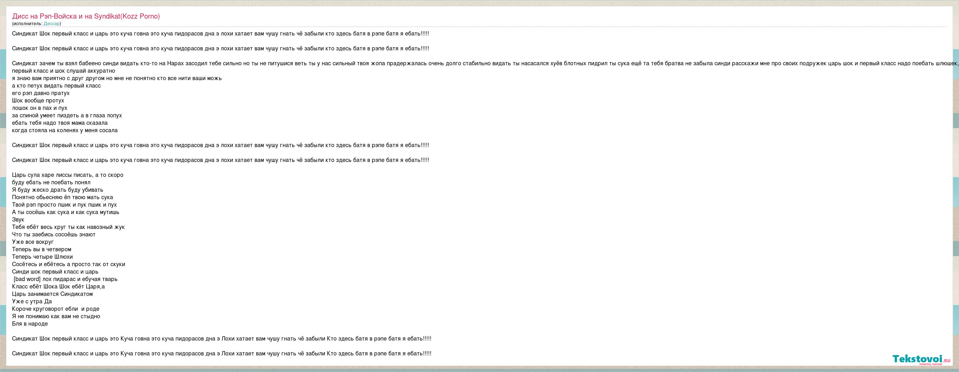Синдикат Шок первый класс и царь это куча говна это куча пидорасов дна э лохи хатает вам чушу гнать чё забыли кто здесь батя в рэпе батя я ебать!!!!! Синдикат Шок первый класс и царь это куча говна это куча пидорасов дна э лохи хатает вам чушу гнать чё забыли кто здесь батя в рэпе батя я ебать!!!!! Синдикат зачем ты взял бабеено синди видать кто-то на Нарах засодил тебе сильно но ты не питушися веть ты у нас сильный твоя жопа прадержалась очень долго стабильно видать ты насасался хуёв блотных пидрил ты сука ещё та тебя братва не забыла синди расскажи мне про своих подружек царь шок и первый класс надо поебать шлюшек, первый класс и шок слушай аккуратно я знаю вам приятно с друг другом но мне не понятно кто все нити ваши можь а кто петух видать первый класс его рэп давно пратух Шок вообще протух лошок он в пах и пух за спиной умеет пиздеть а в глаза лопух ебать тебя надо твоя мама сказала когда стояла на коленях у меня сосала Синдикат Шок первый класс и царь это куча говна это куча пидорасов дна э лохи хатает вам чушу гнать чё забыли кто здесь батя в рэпе батя я ебать!!!!! Синдикат Шок первый класс и царь это куча говна это куча пидорасов дна э лохи хатает вам чушу гнать чё забыли кто здесь батя в рэпе батя я ебать!!!!! Царь сула харе лиссы писать, а то скоро буду ебать не поебать понял Я буду жеско драть буду убивать Понятно обьесняю ёп твою мать сука Твой рэп просто пшик и пук пшик и пух А ты сосёшь как сука и как сука мутишь Звук Тебя ебёт весь круг ты как навозный жук Что ты заебись сосоёшь знают Уже все вокруг Теперь вы в четвером Теперь четыре Шлюхи Сосётесь и ебётесь а просто так от скуки Синди шок первый класс и царь [bad word] лох пидарас и ебучая тварь Класс ебёт Шока Шок ебёт Царя,а Царь занимается Синдикатом Уже с утра Да Короче круговорот ебли и роде Я не понимаю как вам не стыдно Бля в народе Синдикат Шок первый класс и царь это Куча говна это куча пидорасов дна э Лохи хатает вам чушу гнать чё забыли Кто здесь батя в рэпе батя я ебать!!!!! Синдикат Шок первый класс и царь это Куча говна это куча пидорасов дна э Лохи хатает вам чушу гнать чё забыли Кто здесь батя в рэпе батя я ебать!!!!!