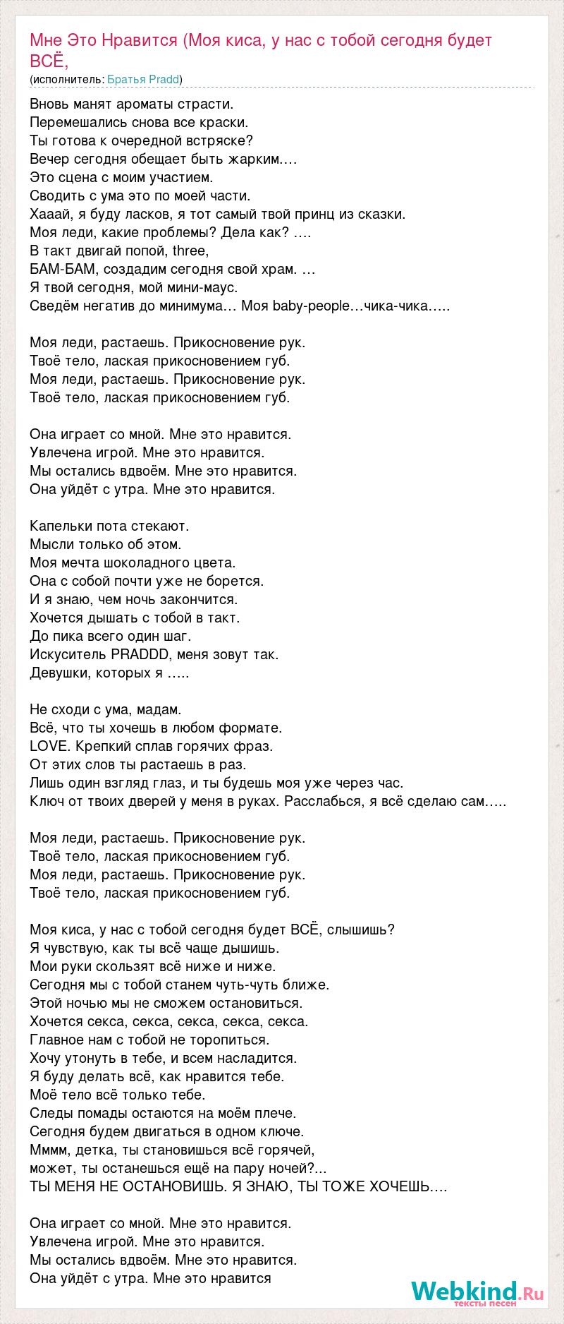 Вновь манят ароматы страсти. Перемешались снова все краски. Ты готова к очередной встряске? Вечер сегодня обещает быть жарким.… Это сцена с моим участием. Сводить с ума это по моей части. Хааай, я буду ласков, я тот самый твой принц из сказки. Моя леди, какие проблемы? Дела как? …. В такт двигай попой, three, БАМ-БАМ, создадим сегодня свой храм. … Я твой сегодня, мой мини-маус. Сведём негатив до минимума… Моя baby-people…чика-чика….. Моя леди, растаешь. Прикосновение рук. Твоё тело, лаская прикосновением губ. Моя леди, растаешь. Прикосновение рук. Твоё тело, лаская прикосновением губ. Она играет со мной. Мне это нравится. Увлечена игрой. Мне это нравится. Мы остались вдвоём. Мне это нравится. Она уйдёт с утра. Мне это нравится. Капельки пота стекают. Мысли только об этом. Моя мечта шоколадного цвета. Она с собой почти уже не борется. И я знаю, чем ночь закончится. Хочется дышать с тобой в такт. До пика всего один шаг. Искуситель PRADDD, меня зовут так. Девушки, которых я ….. Не сходи с ума, мадам. Всё, что ты хочешь в любом формате. LOVE. Крепкий сплав горячих фраз. От этих слов ты растаешь в раз. Лишь один взгляд глаз, и ты будешь моя уже через час. Ключ от твоих дверей у меня в руках. Расслабься, я всё сделаю сам….. Моя леди, растаешь. Прикосновение рук. Твоё тело, лаская прикосновением губ. Моя леди, растаешь. Прикосновение рук. Твоё тело, лаская прикосновением губ. Моя киса, у нас с тобой сегодня будет ВСЁ, слышишь? Я чувствую, как ты всё чаще дышишь. Мои руки скользят всё ниже и ниже. Сегодня мы с тобой станем чуть-чуть ближе. Этой ночью мы не сможем остановиться. Хочется секса, секса, секса, секса, секса. Главное нам с тобой не торопиться. Хочу утонуть в тебе, и всем насладится. Я буду делать всё, как нравится тебе. Моё тело всё только тебе. Следы помады остаются на моём плече. Сегодня будем двигаться в одном ключе. Мммм, детка, ты становишься всё горячей, может, ты останешься ещё на пару ночей?... ТЫ МЕНЯ НЕ ОСТАНОВИШЬ. Я ЗНАЮ, ТЫ ТОЖЕ ХОЧЕШЬ…. Она играет со мной. Мне это нравится. Увлечена игрой. Мне это нравится. Мы остались вдвоём. Мне это нравится. Она уйдёт с утра. Мне это нравится