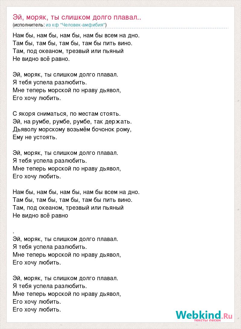 Нам бы, нам бы, нам бы, нам бы всем на дно. Там бы, там бы, там бы, там бы пить вино. Там, под океаном, трезвый или пьяный Не видно всё равно. Эй, моряк, ты слишком долго плавал. Я тебя успела разлюбить. Мне теперь морской по нраву дьявол, Его хочу любить. С якоря сниматься, по местам стоять. Эй, на румбе, румбе, румбе, так держать. Дьяволу морскому возьмём бочонок рому, Ему не устоять. Эй, моряк, ты слишком долго плавал. Я тебя успела разлюбить. Мне теперь морской по нраву дьявол, Его хочу любить. Нам бы, нам бы, нам бы, нам бы всем на дно. Там бы, там бы, там бы, там бы пить вино. Там, под океаном, трезвый или пьяный Не видно всё равно . Эй, моряк, ты слишком долго плавал. Я тебя успела разлюбить. Мне теперь морской по нраву дьявол, Его хочу любить. Эй, моряк, ты слишком долго плавал. Я тебя успела разлюбить. Мне теперь морской по нраву дьявол, Его хочу любить. Его хочу любить.