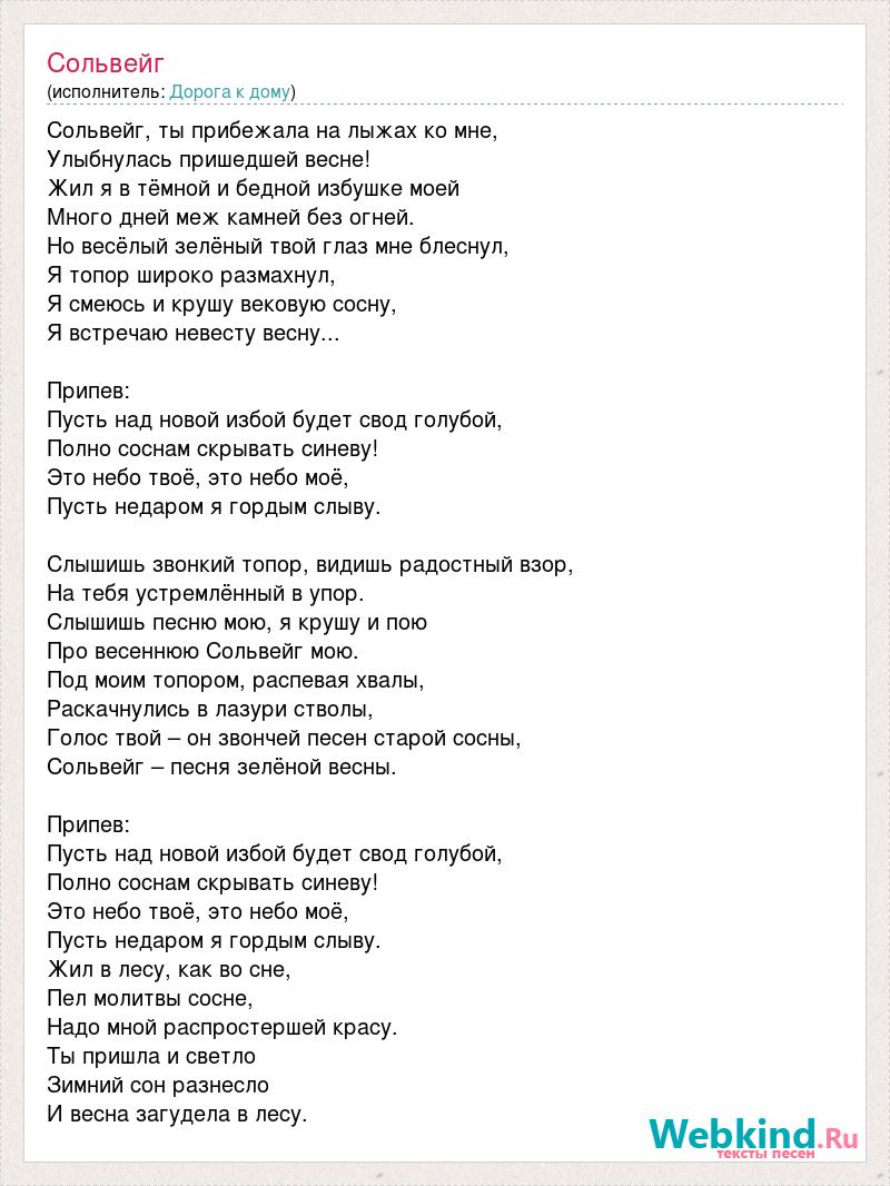 Сольвейг, ты прибежала на лыжах ко мне, Улыбнулась пришедшей весне! Жил я в тёмной и бедной избушке моей Много дней меж камней без огней. Но весёлый зелёный твой глаз мне блеснул, Я топор широко размахнул, Я смеюсь и крушу вековую сосну, Я встречаю невесту весну... Припев: Пусть над новой избой будет свод голубой, Полно соснам скрывать синеву! Это небо твоё, это небо моё, Пусть недаром я гордым слыву. Слышишь звонкий топор, видишь радостный взор, На тебя устремлённый в упор. Слышишь песню мою, я крушу и пою Про весеннюю Сольвейг мою. Под моим топором, распевая хвалы, Раскачнулись в лазури стволы, Голос твой – он звончей песен старой сосны, Сольвейг – песня зелёной весны. Припев: Пусть над новой избой будет свод голубой, Полно соснам скрывать синеву! Это небо твоё, это небо моё, Пусть недаром я гордым слыву. Жил в лесу, как во сне, Пел молитвы сосне, Надо мной распростершей красу. Ты пришла и светло Зимний сон разнесло И весна загудела в лесу.