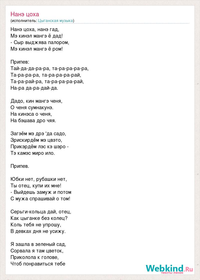 Нанэ цоха, нанэ гад, Мэ кинэл мангэ ё дад! - Сыр выджява палором, Мэ кинэл мангэ ё ром! Припев: Тай-да-да-ра-ра, та-ра-ра-ра-ра, Та-ра-ра-ра, та-ра-ра-ра-рай, Та-ра-рай-ра, та-ра-ра-ра-рай, На-ра да-ра-дай-да. Дадо, кин мангэ ченя, О ченя сумнакунэ. На кинэса о ченя, На бэшава дро чяя. Загэём мэ дрэ 'да садо, Зрискирдём мэ цвэто, Прикэрдём лэс кэ шэро - Тэ камэс миро ило. Припев. Юбки нет, рубашки нет, Ты отец, купи их мне! - Выйдешь замуж и потом С мужа спрашивай о том! Серьги-кольца дай, отец, Как цыганке без колец? Коль тебя не упрошу, В девках дня не усижу. Я зашла в зеленый сад, Сорвала я там цветок, Приколола к голове, Чтоб понравиться тебе