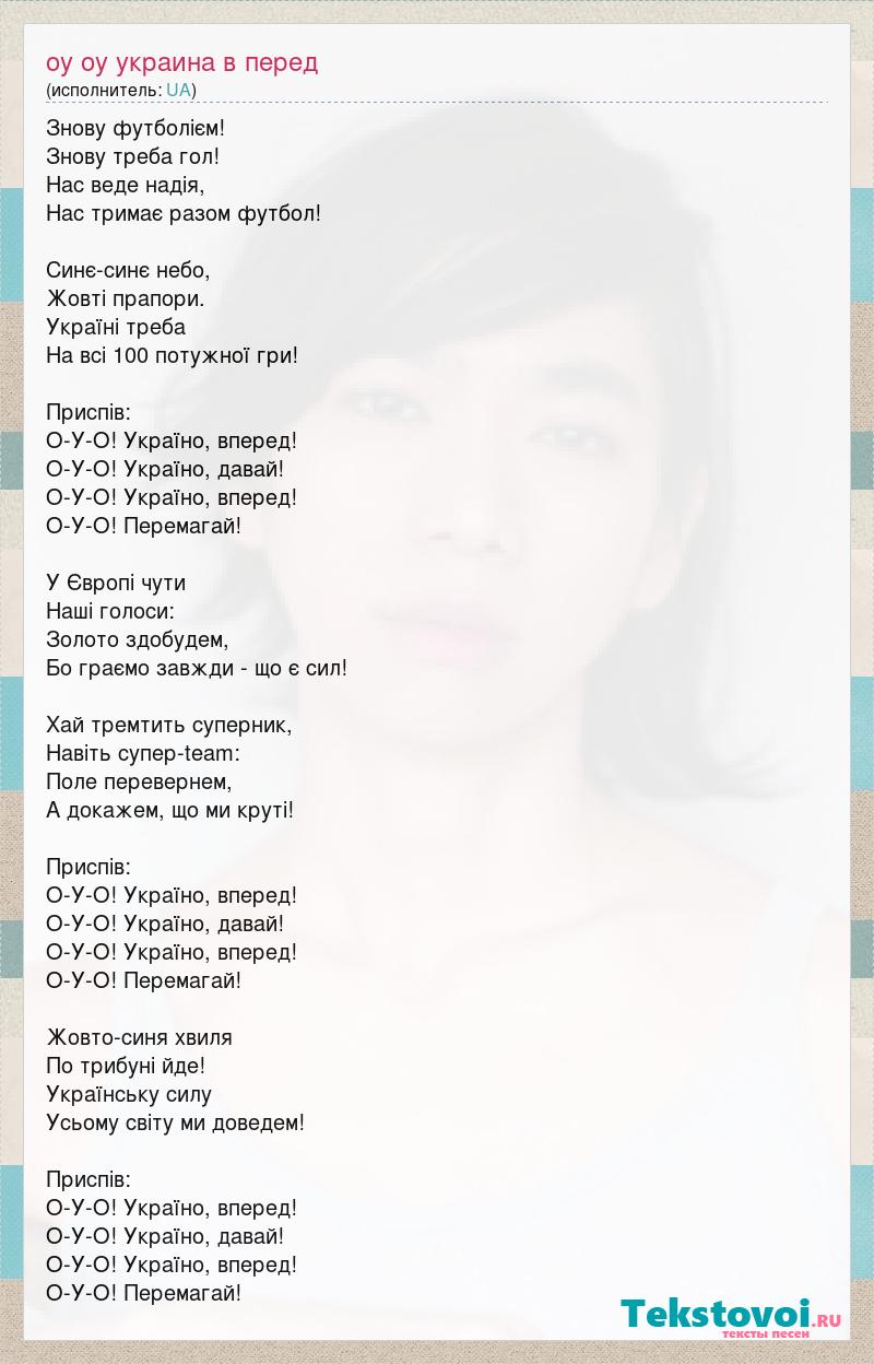 Знову футболієм! Знову треба гол! Нас веде надія, Нас тримає разом футбол! Синє-синє небо, Жовті прапори. Україні треба На всі 100 потужної гри! Приспів: О-У-О! Україно, вперед! О-У-О! Україно, давай! О-У-О! Україно, вперед! О-У-О! Перемагай! У Європі чути Наші голоси: Золото здобудем, Бо граємо завжди - що є сил! Хай тремтить суперник, Навіть супер-team: Поле перевернем, А докажем, що ми круті! Приспів: О-У-О! Україно, вперед! О-У-О! Україно, давай! О-У-О! Україно, вперед! О-У-О! Перемагай! Жовто-синя хвиля По трибуні йде! Українську силу Усьому світу ми доведем! Приспів: О-У-О! Україно, вперед! О-У-О! Україно, давай! О-У-О! Україно, вперед! О-У-О! Перемагай!