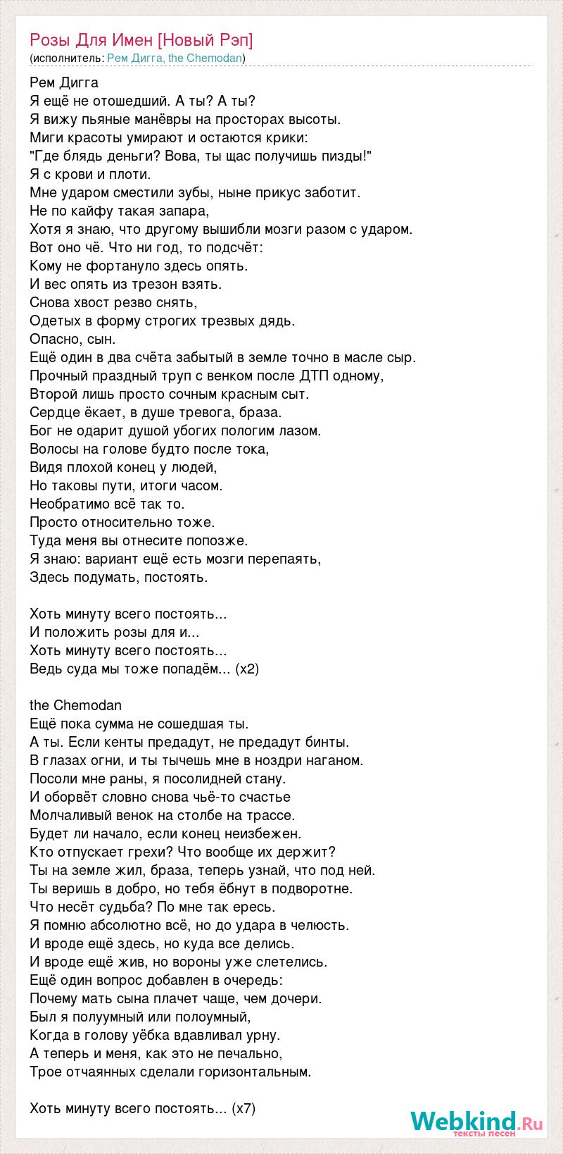 Рем Дигга Я ещё не отошедший. А ты? А ты? Я вижу пьяные манёвры на просторах высоты. Миги красоты умирают и остаются крики: "Где блядь деньги? Вова, ты щас получишь пизды!" Я с крови и плоти. Мне ударом сместили зубы, ныне прикус заботит. Не по кайфу такая запара, Хотя я знаю, что другому вышибли мозги разом с ударом. Вот оно чё. Что ни год, то подсчёт: Кому не фортануло здесь опять. И вес опять из трезон взять. Снова хвост резво снять, Одетых в форму строгих трезвых дядь. Опасно, сын. Ещё один в два счёта забытый в земле точно в масле сыр. Прочный праздный труп с венком после ДТП одному, Второй лишь просто сочным красным сыт. Сердце ёкает, в душе тревога, браза. Бог не одарит душой убогих пологим лазом. Волосы на голове будто после тока, Видя плохой конец у людей, Но таковы пути, итоги часом. Необратимо всё так то. Просто относительно тоже. Туда меня вы отнесите попозже. Я знаю: вариант ещё есть мозги перепаять, Здесь подумать, постоять. Хоть минуту всего постоять... И положить розы для и... Хоть минуту всего постоять... Ведь суда мы тоже попадём... (x2) the Chemodan Ещё пока сумма не сошедшая ты. А ты. Если кенты предадут, не предадут бинты. В глазах огни, и ты тычешь мне в ноздри наганом. Посоли мне раны, я посолидней стану. И оборвёт словно снова чьё-то счастье Молчаливый венок на столбе на трассе. Будет ли начало, если конец неизбежен. Кто отпускает грехи? Что вообще их держит? Ты на земле жил, браза, теперь узнай, что под ней. Ты веришь в добро, но тебя ёбнут в подворотне. Что несёт судьба? По мне так ересь. Я помню абсолютно всё, но до удара в челюсть. И вроде ещё здесь, но куда все делись. И вроде ещё жив, но вороны уже слетелись. Ещё один вопрос добавлен в очередь: Почему мать сына плачет чаще, чем дочери. Был я полуумный или полоумный, Когда в голову уёбка вдавливал урну. А теперь и меня, как это не печально, Трое отчаянных сделали горизонтальным. Хоть минуту всего постоять... (x7)