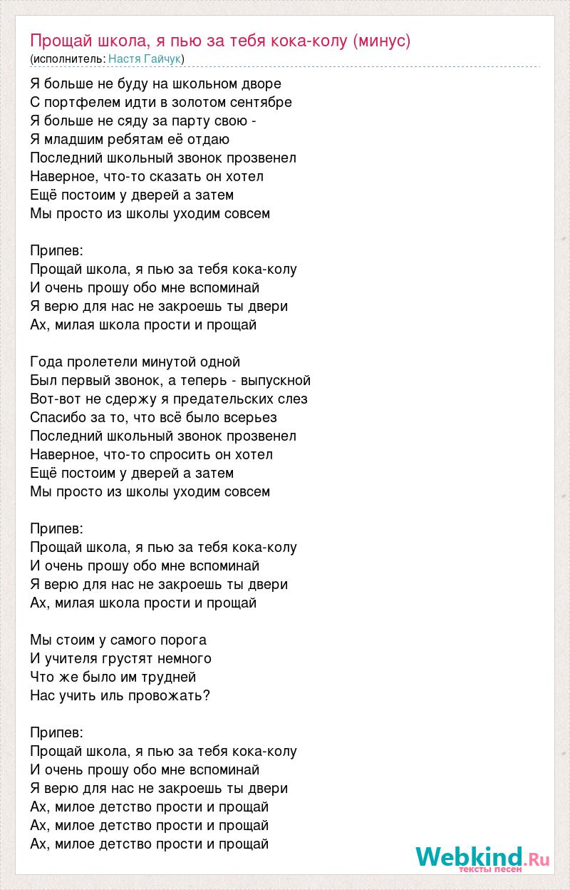 Я больше не буду на школьном дворе С портфелем идти в золотом сентябре Я больше не сяду за парту свою - Я младшим ребятам её отдаю Последний школьный звонок прозвенел Наверное, что-то сказать он хотел Ещё постоим у дверей а затем Мы просто из школы уходим совсем Припев: Прощай школа, я пью за тебя кока-колу И очень прошу обо мне вспоминай Я верю для нас не закроешь ты двери Ах, милая школа прости и прощай Года пролетели минутой одной Был первый звонок, а теперь - выпускной Вот-вот не сдержу я предательских слез Спасибо за то, что всё было всерьез Последний школьный звонок прозвенел Наверное, что-то спросить он хотел Ещё постоим у дверей а затем Мы просто из школы уходим совсем Припев: Прощай школа, я пью за тебя кока-колу И очень прошу обо мне вспоминай Я верю для нас не закроешь ты двери Ах, милая школа прости и прощай Мы стоим у самого порога И учителя грустят немного Что же было им трудней Нас учить иль провожать? Припев: Прощай школа, я пью за тебя кока-колу И очень прошу обо мне вспоминай Я верю для нас не закроешь ты двери Ах, милое детство прости и прощай Ах, милое детство прости и прощай Ах, милое детство прости и прощай