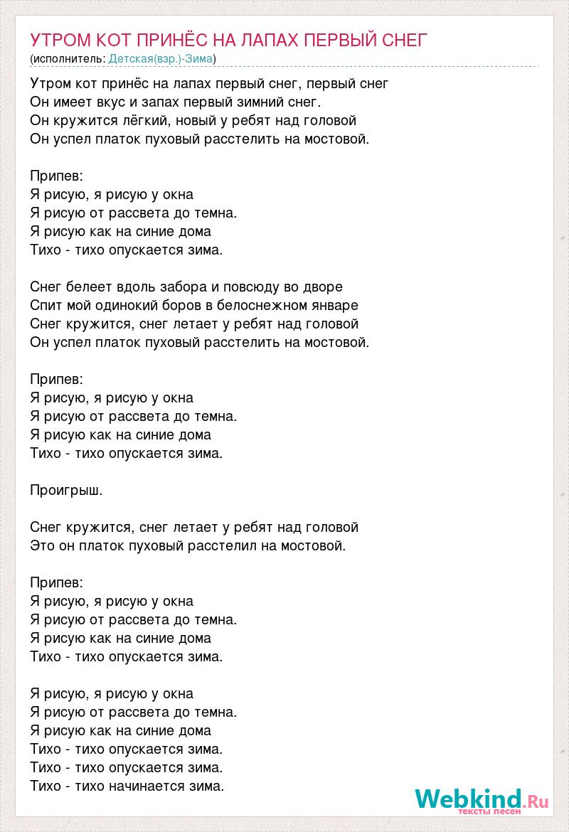 Утром кот принёс на лапах первый снег, первый снег Он имеет вкус и запах первый зимний снег. Он кружится лёгкий, новый у ребят над головой Он успел платок пуховый расстелить на мостовой. Припев: Я рисую, я рисую у окна Я рисую от рассвета до темна. Я рисую как на синие дома Тихо - тихо опускается зима. Снег белеет вдоль забора и повсюду во дворе Спит мой одинокий боров в белоснежном январе Снег кружится, снег летает у ребят над головой Он успел платок пуховый расстелить на мостовой. Припев: Я рисую, я рисую у окна Я рисую от рассвета до темна. Я рисую как на синие дома Тихо - тихо опускается зима. Проигрыш. Снег кружится, снег летает у ребят над головой Это он платок пуховый расстелил на мостовой. Припев: Я рисую, я рисую у окна Я рисую от рассвета до темна. Я рисую как на синие дома Тихо - тихо опускается зима. Я рисую, я рисую у окна Я рисую от рассвета до темна. Я рисую как на синие дома Тихо - тихо опускается зима. Тихо - тихо опускается зима. Тихо - тихо начинается зима.