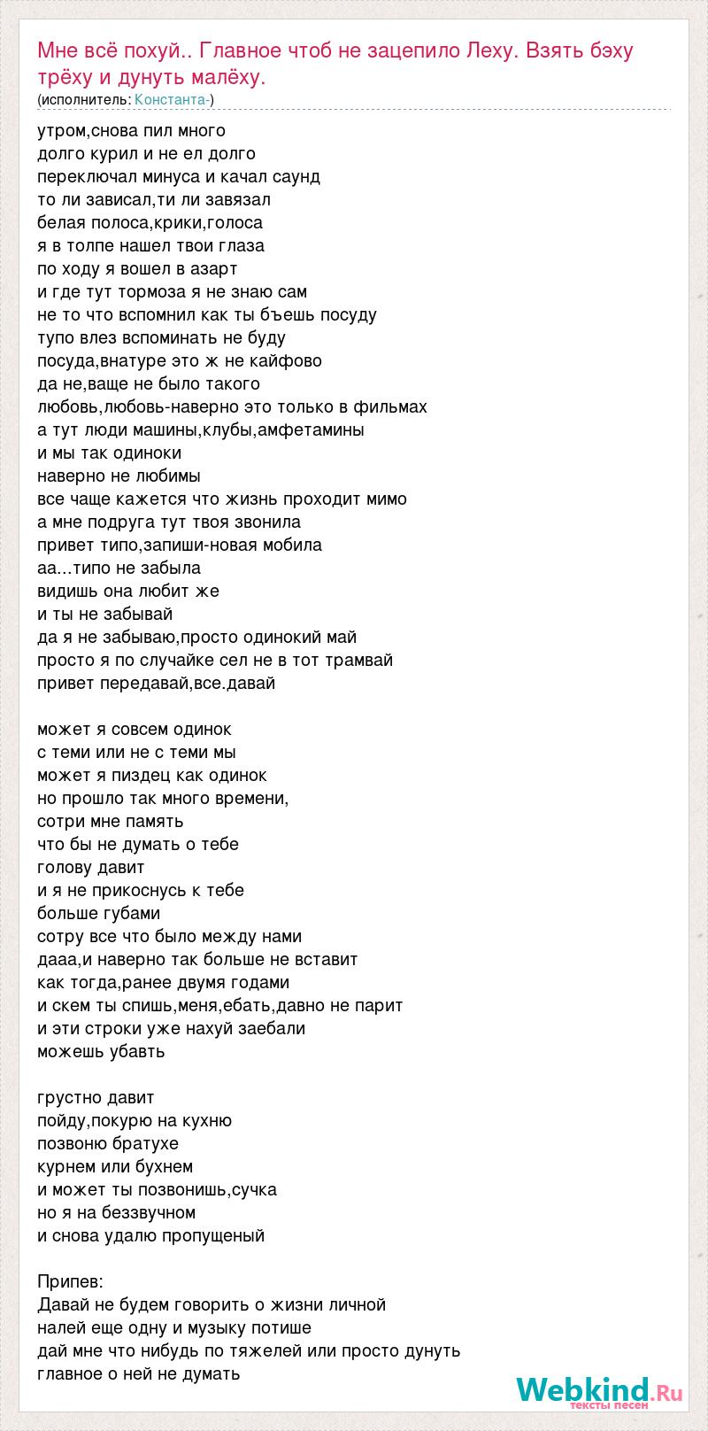 Главная→Исполнители→Константа-→Мне всё похуй.. Главное чтоб не зацепило Леху. Взять бэху трёху и дунуть