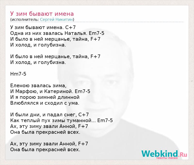 У зим бывают имена. C+7 Одна из них звалась Наталья. Em7-5 И было в ней мерцанье, тайна, F+7 И холод, и голубизна. И было в ней мерцанье, тайна, F+7 И холод, и голубизна. Hm7-5 Eленою звалась зима, И Марфою, и Катериной. Em7-5 И я порою зимней длинной Влюблялся и сходил с ума. И были дни, и падал снег, C+7 Как теплый пух зимы туманной... Em7-5 Ах, эту зиму звали Анной, F+7 Она была прекрасней всех. Ах, эту зиму звали Анной, F+7 Она была прекрасней всех.