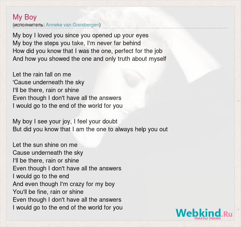 My boy I loved you since you opened up your eyes My boy the steps you take, I'm never far behind How did you know that I was the one, perfect for the job And how you showed the one and only truth about myself Let the rain fall on me 'Cause underneath the sky I'll be there, rain or shine Even though I don't have all the answers I would go to the end of the world for you My boy I see your joy, I feel your doubt But did you know that I am the one to always help you out Let the sun shine on me Cause underneath the sky I'll be there, rain or shine Even though I don't have all the answers I would go to the end And even though I'm crazy for my boy You'll be fine, rain or shine Even though I don't have all the answers I would go to the end of the world for you