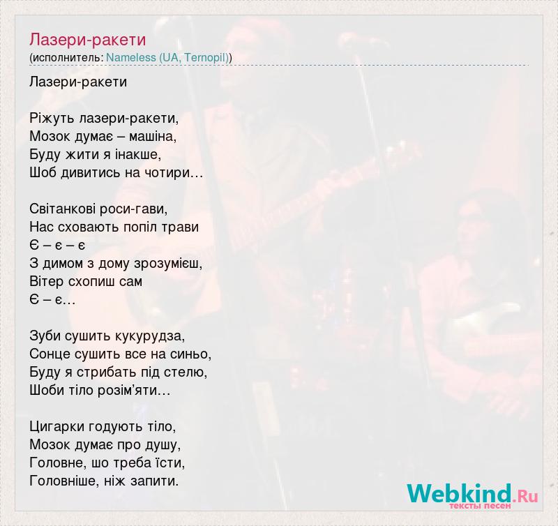Лазери-ракети Ріжуть лазери-ракети, Мозок думає – машіна, Буду жити я інакше, Шоб дивитись на чотири… Світанкові роси-гави, Нас сховають попіл трави Є – є – є З димом з дому зрозумієш, Вітер схопиш сам Є – є… Зуби сушить кукурудза, Сонце сушить все на синьо, Буду я стрибать під стелю, Шоби тіло розім’яти… Цигарки годують тіло, Мозок думає про душу, Головне, шо треба їсти, Головніше, ніж запити.