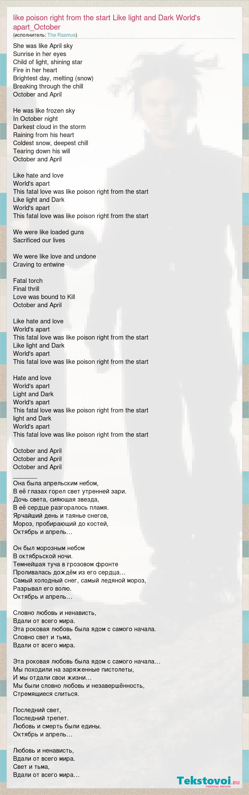 She was like April sky Sunrise in her eyes Child of light, shining star Fire in her heart Brightest day, melting (snow) Breaking through the chill October and April He was like frozen sky In October night Darkest cloud in the storm Raining from his heart Coldest snow, deepest chill Tearing down his will October and April Like hate and love World's apart This fatal love was like poison right from the start Like light and Dark World's apart This fatal love was like poison right from the start We were like loaded guns Sacrificed our lives We were like love and undone Craving to entwine Fatal torch Final thrill Love was bound to Kill October and April Like hate and love World's apart This fatal love was like poison right from the start Like light and Dark World's apart This fatal love was like poison right from the start Hate and love World's apart Light and Dark World's apart This fatal love was like poison right from the start light and Dark World's apart This fatal love was like poison right from the start October and April October and April October and April _______ Она была апрельским небом, В её глазах горел свет утренней зари. Дочь света, сияющая звезда, В её сердце разгоралось пламя. Ярчайший день и таянье снегов, Мороз, пробирающий до костей, Октябрь и апрель… Он был морозным небом В октябрьской ночи. Темнейшая туча в грозовом фронте Проливалась дождём из его сердца… Самый холодный снег, самый ледяной мороз, Разрывал его волю. Октябрь и апрель… Словно любовь и ненависть, Вдали от всего мира. Эта роковая любовь была ядом с самого начала. Словно свет и тьма, Вдали от всего мира. Эта роковая любовь была ядом с самого начала… Мы походили на заряженные пистолеты, И мы отдали свои жизни… Мы были словно любовь и незавершённость, Стремящиеся слиться. Последний свет, Последний трепет. Любовь и смерть были едины. Октябрь и апрель… Любовь и ненависть, Вдали от всего мира. Свет и тьма, Вдали от всего мира…