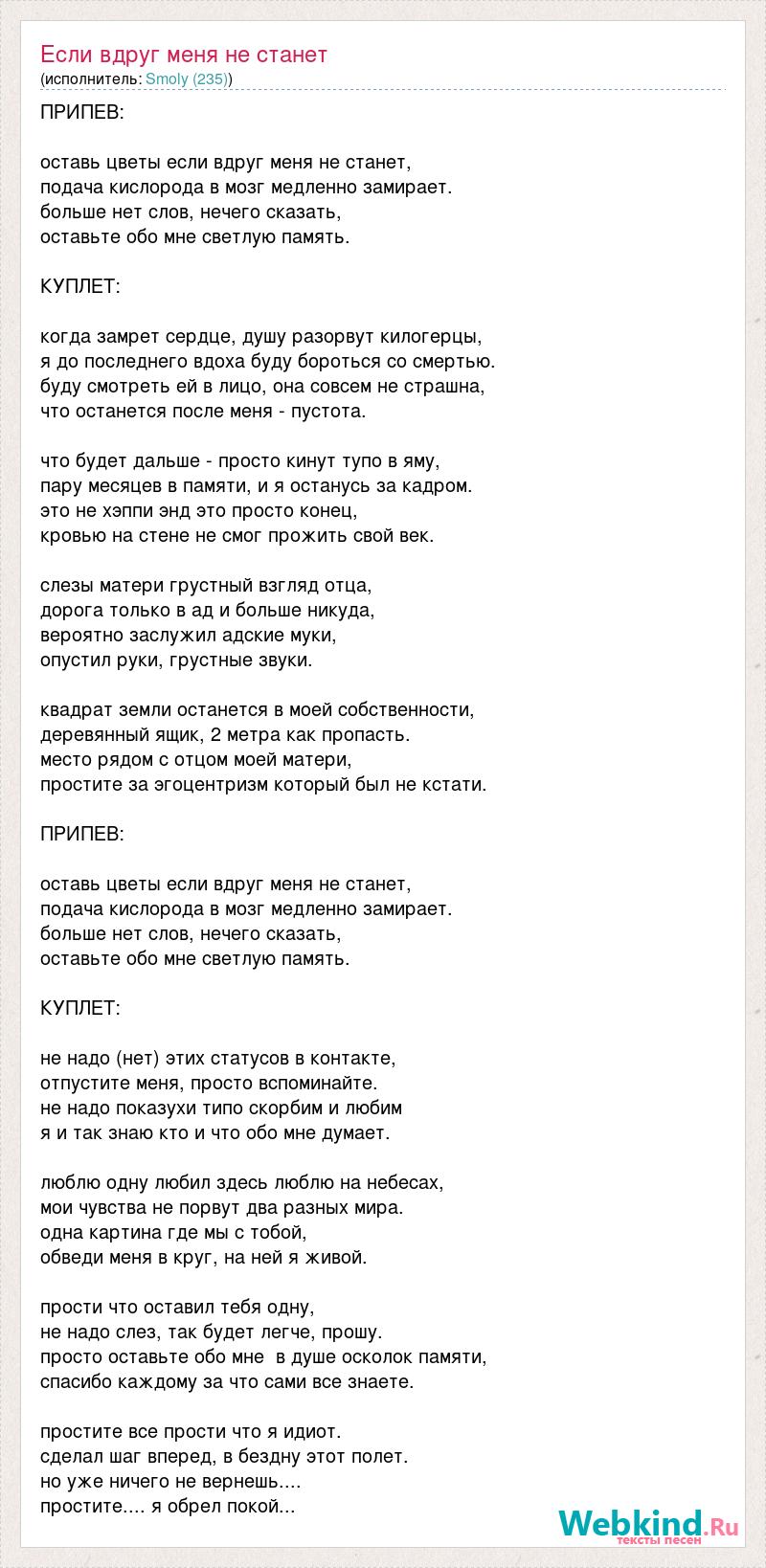 ПРИПЕВ: оставь цветы если вдруг меня не станет, подача кислорода в мозг медленно замирает. больше нет слов, нечего сказать, оставьте обо мне светлую память. КУПЛЕТ: когда замрет сердце, душу разорвут килогерцы, я до последнего вдоха буду бороться со смертью. буду смотреть ей в лицо, она совсем не страшна, что останется после меня - пустота. что будет дальше - просто кинут тупо в яму, пару месяцев в памяти, и я останусь за кадром. это не хэппи энд это просто конец, кровью на стене не смог прожить свой век. слезы матери грустный взгляд отца, дорога только в ад и больше никуда, вероятно заслужил адские муки, опустил руки, грустные звуки. квадрат земли останется в моей собственности, деревянный ящик, 2 метра как пропасть. место рядом с отцом моей матери, простите за эгоцентризм который был не кстати. ПРИПЕВ: оставь цветы если вдруг меня не станет, подача кислорода в мозг медленно замирает. больше нет слов, нечего сказать, оставьте обо мне светлую память. КУПЛЕТ: не надо (нет) этих статусов в контакте, отпустите меня, просто вспоминайте. не надо показухи типо скорбим и любим я и так знаю кто и что обо мне думает. люблю одну любил здесь люблю на небесах, мои чувства не порвут два разных мира. одна картина где мы с тобой, обведи меня в круг, на ней я живой. прости что оставил тебя одну, не надо слез, так будет легче, прошу. просто оставьте обо мне в душе осколок памяти, спасибо каждому за что сами все знаете. простите все прости что я идиот. сделал шаг вперед, в бездну этот полет. но уже ничего не вернешь.... простите.... я обрел покой...