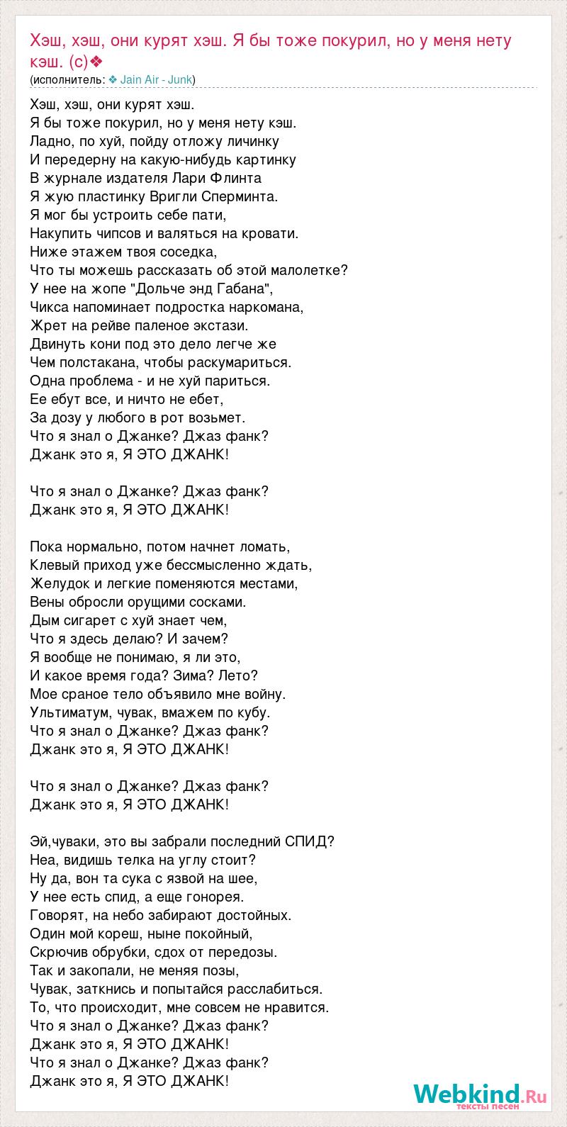 Главная→Исполнители→❖ Jain Air - Junk→Хэш, хэш, они курят хэш. Я бы тоже покурил, но у меня нету кэш. (с)❖