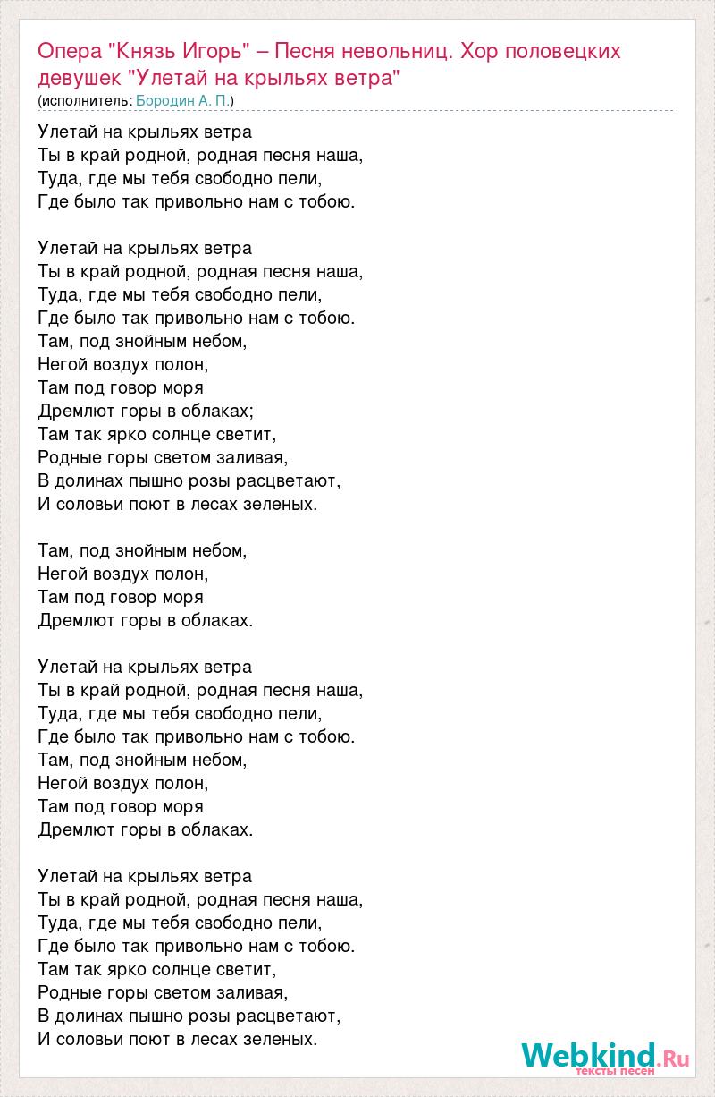 Улетай на крыльях ветра Ты в край родной, родная песня наша, Туда, где мы тебя свободно пели, Где было так привольно нам с тобою. Улетай на крыльях ветра Ты в край родной, родная песня наша, Туда, где мы тебя свободно пели, Где было так привольно нам с тобою. Там, под знойным небом, Негой воздух полон, Там под говор моря Дремлют горы в облаках; Там так ярко солнце светит, Родные горы светом заливая, В долинах пышно розы расцветают, И соловьи поют в лесах зеленых. Там, под знойным небом, Негой воздух полон, Там под говор моря Дремлют горы в облаках. Улетай на крыльях ветра Ты в край родной, родная песня наша, Туда, где мы тебя свободно пели, Где было так привольно нам с тобою. Там, под знойным небом, Негой воздух полон, Там под говор моря Дремлют горы в облаках. Улетай на крыльях ветра Ты в край родной, родная песня наша, Туда, где мы тебя свободно пели, Где было так привольно нам с тобою. Там так ярко солнце светит, Родные горы светом заливая, В долинах пышно розы расцветают, И соловьи поют в лесах зеленых.