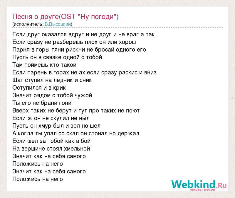 Если друг оказался вдруг и не друг и не враг а так Если сразу не разберешь плох он или хорош Парня в горы тяни рискни не бросай одного его Пусть он в связке одной с тобой Там поймешь кто такой Если парень в горах не ах если сразу раскис и вниз Шаг ступил на ледник и сник Оступился и в крик Значит рядом с тобой чужой Ты его не брани гони Вверх таких не берут и тут про таких не поют Если ж он не скулил не ныл Пусть он хмур был и зол но шел А когда ты упал со скал он стонал но держал Если шел за тобой как в бой На вершине стоял хмельной Значит как на себя самого Положись на него Значит как на себя самого Положись на него