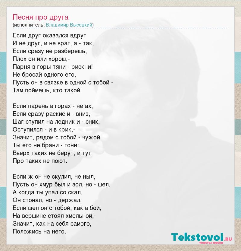 Если друг оказался вдруг И не друг, и не враг, а - так, Если сразу не разберешь, Плох он или хорош,- Парня в горы тяни - рискни! Не бросай одного его, Пусть он в связке в одной с тобой - Там поймешь, кто такой. Если парень в горах - не ах, Если сразу раскис и - вниз, Шаг ступил на ледник и - сник, Оступился - и в крик,- Значит, рядом с тобой - чужой, Ты его не брани - гони: Вверх таких не берут, и тут Про таких не поют. Если ж он не скулил, не ныл, Пусть он хмур был и зол, но - шел, А когда ты упал со скал, Он стонал, но - держал, Если шел он с тобой, как в бой, На вершине стоял хмельной,- Значит, как на себя самого, Положись на него.